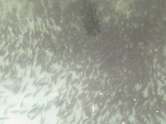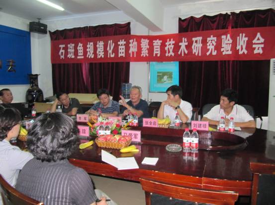 驗(yàn)收專家組認(rèn)真聽取了課題組的工作匯報(bào),考察了萊州明波水產(chǎn)有限公司的生產(chǎn)現(xiàn)場,查閱了相關(guān)生產(chǎn)及實(shí)驗(yàn)記錄,現(xiàn)場取樣計(jì)數(shù)了七帶石斑、云紋石斑親魚及苗種數(shù)量,測定了苗種全長。確認(rèn):項(xiàng)目實(shí)施期間,課題組培育七帶石斑魚種魚369尾;云紋石斑魚種魚386尾;成功采用激素誘導(dǎo)獲得兩種石斑魚功能性雄魚轉(zhuǎn)化率分別為80%和95%。培育出七帶石斑魚苗10.7萬尾(6.9cm-11.7cm),云紋石斑魚苗51.5萬尾(4.2-8.9cm),云紋石斑魚(♀)×七帶石斑魚(♂)雜交魚苗1萬尾(3.4-5.0cm)。