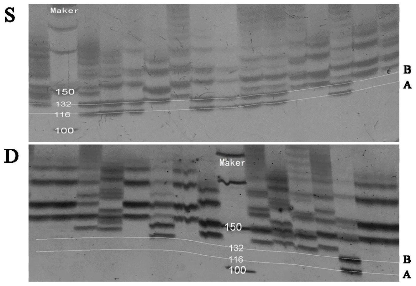 本發(fā)明涉及一個(gè)與紅鰭東方鲀耐低溫相關(guān)的微衛(wèi)星標(biāo)記及其應(yīng)用,屬于魚(yú)類(lèi)DNA標(biāo)記技術(shù)與應(yīng)用領(lǐng)域,具體涉及紅鰭東方鲀耐低溫分子標(biāo)記的篩選,以及利用標(biāo)記進(jìn)行分子標(biāo)記輔助育種。利用BSA?SSR技術(shù)篩選到1個(gè)與紅鰭東方鲀耐低溫相關(guān)的微衛(wèi)星標(biāo)記(fms108),其引物序列為正向:AACATGCGACAGAACTGACTG,反向:TCCACAGCCAATGTTAATGG。根據(jù)此標(biāo)記可以進(jìn)行育種親本的選擇,從而提高后代的耐低溫性能。