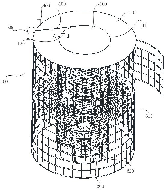 本發(fā)明公開一種筏式立體養(yǎng)殖裝置及養(yǎng)殖方法,包括有:第一養(yǎng)殖網(wǎng)箱;第二養(yǎng)殖網(wǎng)箱,其可拆的設(shè)置在第一養(yǎng)殖網(wǎng)箱內(nèi),在第二養(yǎng)殖網(wǎng)箱內(nèi)形成有第一養(yǎng)殖空間,在第二養(yǎng)殖網(wǎng)箱上設(shè)置有攝像元件和水溫檢測元件,在第二養(yǎng)殖網(wǎng)箱和第一養(yǎng)殖網(wǎng)箱之間有第二養(yǎng)殖空間;第一承載部件,環(huán)繞第二養(yǎng)殖網(wǎng)箱設(shè)置;第二承載部件,設(shè)置在第二養(yǎng)殖網(wǎng)箱內(nèi),設(shè)置有多個,沿第二養(yǎng)殖網(wǎng)箱的高度方向設(shè)置,相鄰的2個第一承載部件之間具有間距;主控器,與攝像元件、水溫檢測元件通訊連接。