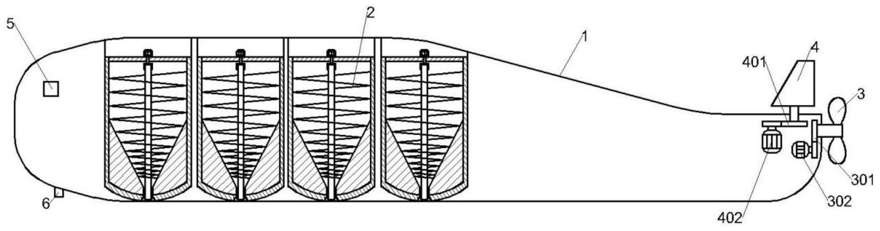 本發(fā)明涉及海洋漁業(yè)配套設(shè)施領(lǐng)域,尤其涉及一種潛水巡航式投餌裝置,包括外殼,所述外殼內(nèi)部設(shè)置有至少一個餌料投放組件,所述外殼外側(cè)設(shè)置有潛水結(jié)構(gòu),所述外殼后端設(shè)置有驅(qū)動組件,所述外殼后端上方設(shè)置有轉(zhuǎn)向組件,所述外殼的前端內(nèi)部設(shè)置有控制模塊,所述控制模塊電性連接有數(shù)據(jù)收集模塊,所述控制模塊分別與所述餌料投放組件、驅(qū)動組件、轉(zhuǎn)向組件電性連接;所述數(shù)據(jù)收集模塊用于監(jiān)測水下環(huán)境并觀察水下情況。