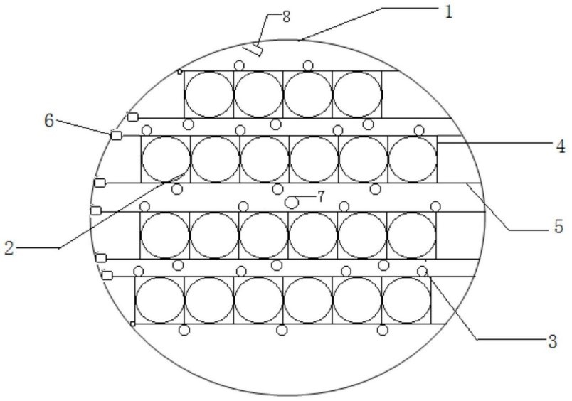 本發(fā)明公開了一種萊氏擬烏賊受精卵孵化系統(tǒng)及使用方法,屬于水產(chǎn)養(yǎng)殖領(lǐng)域,所述系統(tǒng)包括孵化池、孵化筐、固定支架;養(yǎng)殖池內(nèi)擺放固定支架,將孵化筐固定在固定支架上,固定支架周邊安裝有浮球;所述系統(tǒng)能夠防止孵化筐因沖撞造成傾斜而使受精卵相互擠壓,減少了受精卵發(fā)霉腐爛,并充分利用了孵化水體空間。