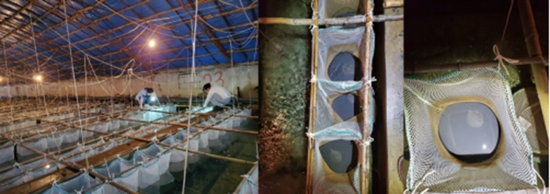 本發(fā)明涉及一種用于大規(guī)模測(cè)定大菱鲆個(gè)體飼料轉(zhuǎn)化率的裝置及方法,屬于水產(chǎn)養(yǎng)殖領(lǐng)域,所述方法包括如下步驟:(1)制作圓柱形尼龍網(wǎng)箱,底部用圓形PVC板作為支撐。(2)將網(wǎng)箱固定到長(zhǎng)方形的養(yǎng)殖池內(nèi),單獨(dú)飼養(yǎng)大菱鲆。(3)投喂顆粒飼料并記錄每條魚的日攝食粒數(shù)。(4)根據(jù)公式:個(gè)體飼料轉(zhuǎn)化率=個(gè)體增重/個(gè)體實(shí)際總攝食量,得到測(cè)試周期內(nèi)每尾大菱鲆的個(gè)體飼料轉(zhuǎn)化率。