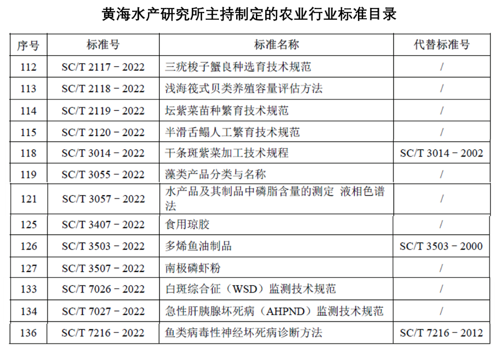 11月11日,農(nóng)業(yè)農(nóng)村部印發(fā)《中華人民共和國(guó)農(nóng)業(yè)農(nóng)村部公告第618號(hào)》,公布了160項(xiàng)經(jīng)專家審定通過(guò)的農(nóng)業(yè)行業(yè)標(biāo)準(zhǔn),自2023年3月1日起實(shí)施。由中國(guó)水產(chǎn)科學(xué)研究院黃海水產(chǎn)研究所科研人員牽頭主持完成的13項(xiàng)農(nóng)業(yè)行業(yè)標(biāo)準(zhǔn)正式獲批發(fā)布,其中包括良種選育規(guī)范4項(xiàng)、水產(chǎn)品加工領(lǐng)域6項(xiàng)及病害監(jiān)測(cè)技術(shù)規(guī)范3項(xiàng)。以上標(biāo)準(zhǔn)的發(fā)布和實(shí)施,有利于規(guī)范和引導(dǎo)水產(chǎn)養(yǎng)殖、病害防控、水產(chǎn)加工行業(yè)的發(fā)展,對(duì)提高漁業(yè)管理水平、促進(jìn)產(chǎn)業(yè)可持續(xù)發(fā)展和規(guī)范市場(chǎng)行為等方面發(fā)揮重要作用。