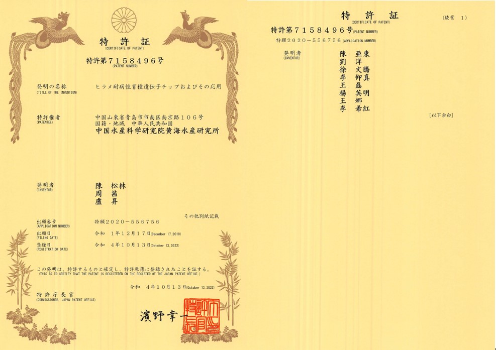 近日,由中國水產(chǎn)科學研究院黃海水產(chǎn)研究所陳松林等研究發(fā)明的“一種牙鲆抗病育種基因芯片及其應用”獲日本發(fā)明專利授權,專利號:特許第7158496號。