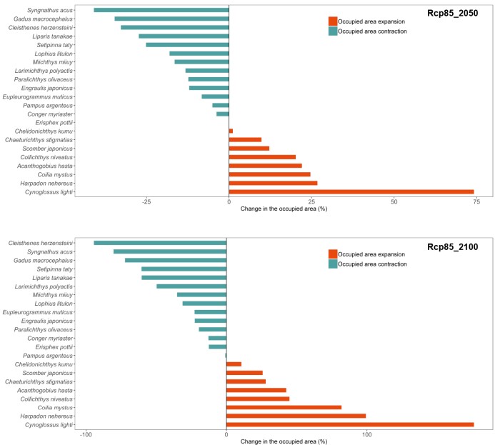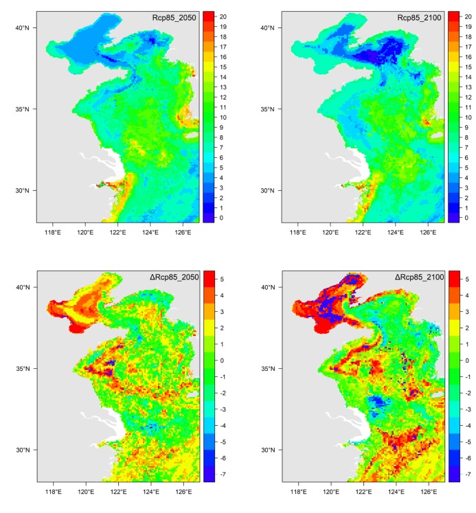 圖1 Rcp8.5情景下黃渤海重要魚類棲息地面積變化(2050年和2100年)