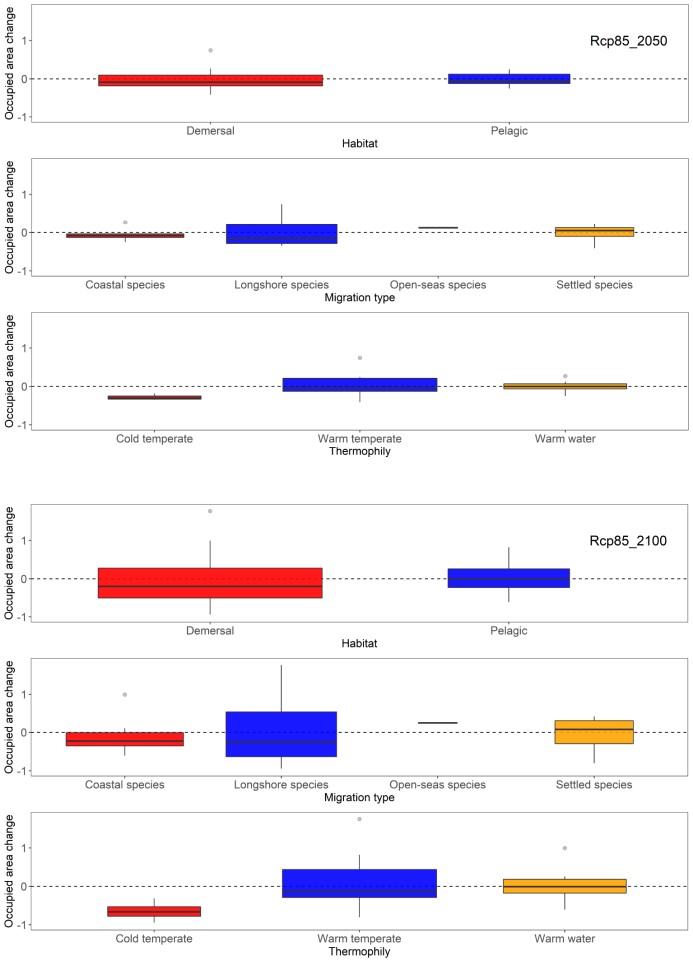 中國(guó)水產(chǎn)科學(xué)研究院黃海水產(chǎn)研究所漁業(yè)資源生態(tài)學(xué)團(tuán)隊(duì)圍繞氣候變化對(duì)漁業(yè)資源分布的潛在影響開展了系列研究,以黃渤海23種重要魚類為研究對(duì)象,解析了其地理分布格局及主要環(huán)境驅(qū)動(dòng)因子,揭示了不同魚類分布對(duì)氣候變化的差異性響應(yīng),預(yù)估了不同氣候變化情景下其未來(lái)?xiàng)⒌氐臐撛谧兓嚓P(guān)研究成果以“Predicting current and future global distribution of black rockfish (Sebastes schlegelii) under changing climate”和“Ensemble projections of fish distribution in response to climate changes in the Yellow and Bohai Seas, China”為題在國(guó)際學(xué)術(shù)期刊Ecological Indicators發(fā)表。