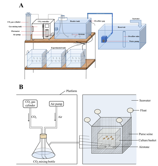 “現(xiàn)場流水”酸化模擬實(shí)驗(yàn)系統(tǒng)(A)和“海上原位”酸化模擬實(shí)驗(yàn)平臺(B)示意圖