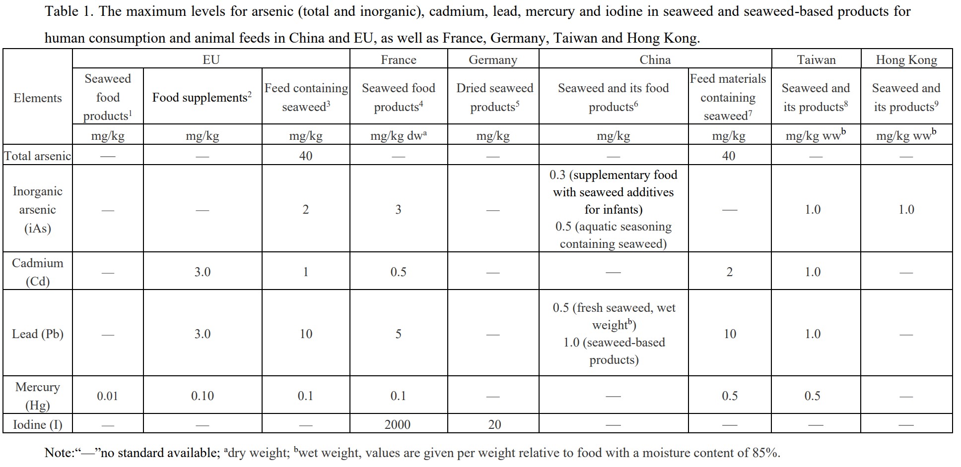 海藻中優(yōu)先關(guān)注的潛在化學(xué)危害是無機(jī)砷、鎘和碘元素,但是其風(fēng)險大小具體取決于海藻種類、海藻消費(fèi)量以及后續(xù)加工或烹飪方法。目前由于缺乏全球海藻消費(fèi)量、消費(fèi)方式、海藻中元素的生物利用度以及加工方式對海藻中元素的影響等大量科學(xué)數(shù)據(jù)支撐,涉及海藻生產(chǎn)、加工和利用的國際標(biāo)準(zhǔn)法規(guī)缺失,然而不同國家、地區(qū)之間對海藻的食用安全性認(rèn)知和海藻產(chǎn)品中污染物、碘的限量規(guī)定存在很大差異,在一定程度上限制了海藻產(chǎn)品的國際貿(mào)易和開發(fā)利用。