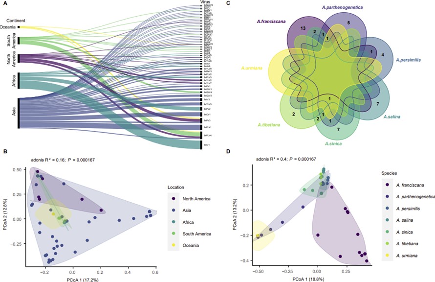 D:不同鹵蟲種間RNA病毒分布PCoA圖