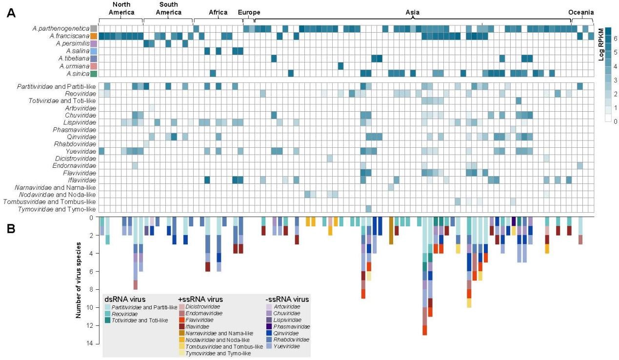 圖2 鹵蟲中RNA病毒在不同地理位置和鹵蟲物種之間的分布