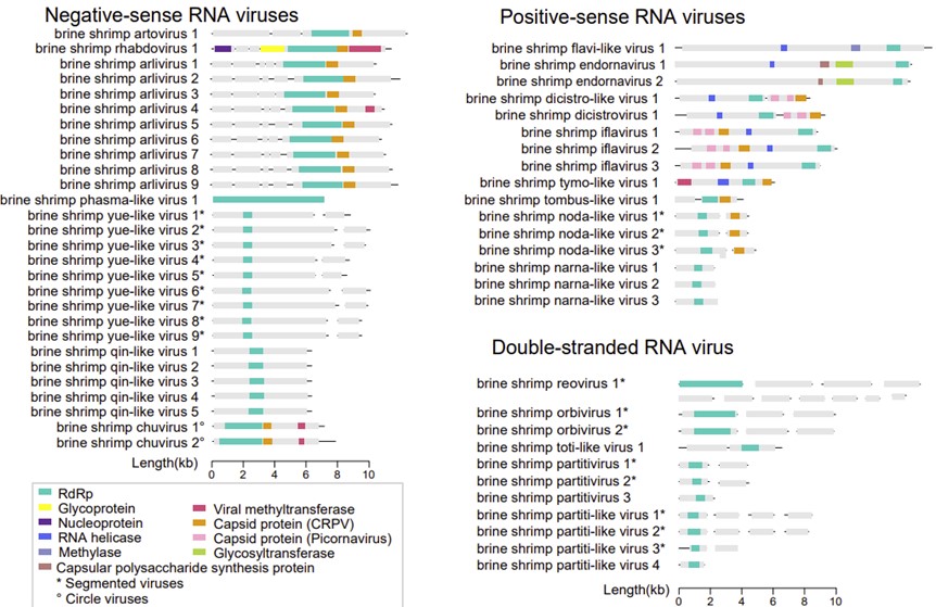 高鹽生態(tài)系統(tǒng)包括鹽湖、鹽沼等,具有高鹽度、高冰點(diǎn)和溶氧變化快等特點(diǎn),被視為“極端生態(tài)系統(tǒng)”。鹵蟲(Artemia)為廣鹽性生物,在全球高鹽生態(tài)系統(tǒng)中均有分布,是水產(chǎn)養(yǎng)殖中重要的生物餌料。該研究對(duì)1977-2019年收集自六大洲、21個(gè)國(guó)家和100多個(gè)采樣地的143批鹵蟲卵樣本開展病毒組分析,鑒定到可歸類為18個(gè)不同病毒家族和相關(guān)類群的55種新型RNA病毒,分析揭示出一些病毒間存在全球聯(lián)系,特別是在亞洲和北美洲之間,發(fā)現(xiàn)人類活動(dòng)可能推動(dòng)了這些病毒間的全球關(guān)聯(lián)性。研究揭示了鹵蟲中病毒的多樣性,為了解全球高鹽生態(tài)系統(tǒng)中以前未被認(rèn)識(shí)的RNA病毒圈提供了新的見解。
