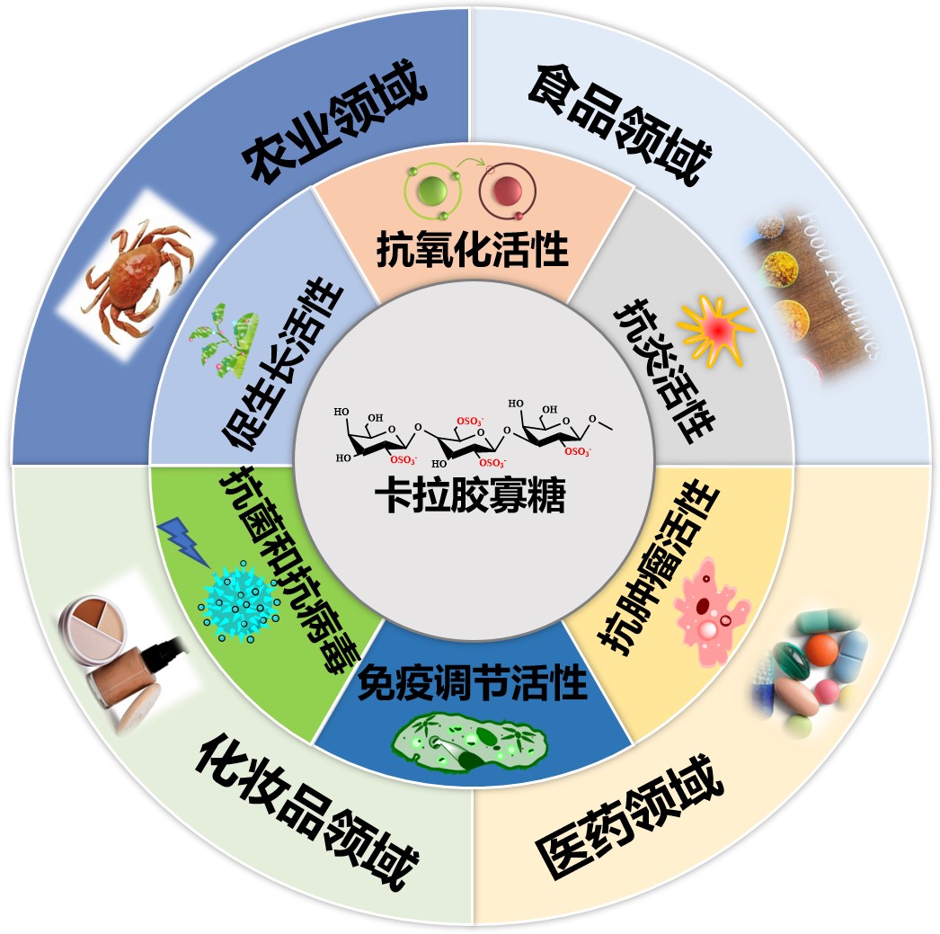 黃海水產(chǎn)研究所海洋產(chǎn)物資源與酶工程團(tuán)隊(duì)主要從事海洋酶的開(kāi)發(fā)與利用,在本領(lǐng)域陸續(xù)發(fā)表了多篇研究性論文,取得了一系列創(chuàng)新性成果。本綜述基于不同類(lèi)型、不同功能的卡拉膠降解酶,系統(tǒng)闡述了其在寡糖制備、紅藻多糖生物煉制、特定多糖和寡糖結(jié)構(gòu)鑒定等方面的潛在應(yīng)用,詳細(xì)討論了海洋微生物體內(nèi)卡拉膠代謝途徑的分類(lèi)及特點(diǎn),并對(duì)如何進(jìn)一步精準(zhǔn)挖掘卡拉膠降解酶和構(gòu)建酶高效酶級(jí)聯(lián)催化體系提出了展望,將為卡拉膠多糖資源的綠色生物加工提供重要參考。