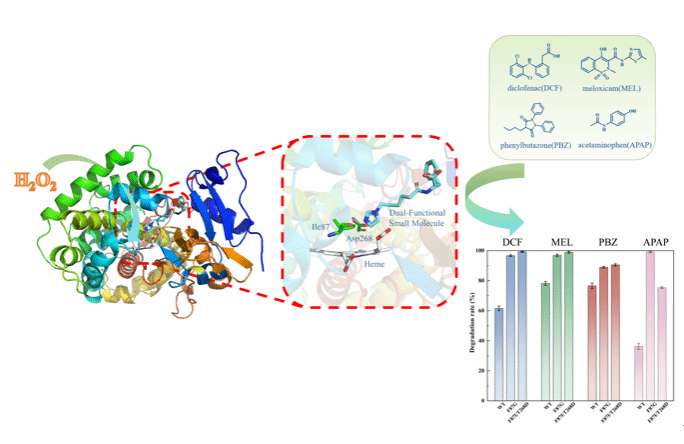 研究團(tuán)隊(duì)通過計(jì)算機(jī)模擬、基因工程和化學(xué)修飾相結(jié)合的方式,成功設(shè)計(jì)開發(fā)出一系列基于血紅素蛋白(細(xì)胞色素P450BM3和肌紅蛋白)的新型人工生物酶,實(shí)現(xiàn)了對(duì)雙氯芬酸、美洛昔康、保泰松、對(duì)乙酰氨基酚四種經(jīng)典非甾體抗炎藥的綠色高效生物降解,降解效率10分鐘內(nèi)便可達(dá)到90.51%-100%。與現(xiàn)有的微生物和酶降解系統(tǒng)(如Labrys portucalensis F11菌株、假單胞菌Pseudomonas sp. PrS10、漆酶等)相比,該新型生物酶系統(tǒng)的催化活性顯著提升,降解時(shí)間大幅縮短。研究成果為環(huán)境中非甾體抗炎藥的綠色高效降解提供了新的思路,具有廣泛的應(yīng)用前景。