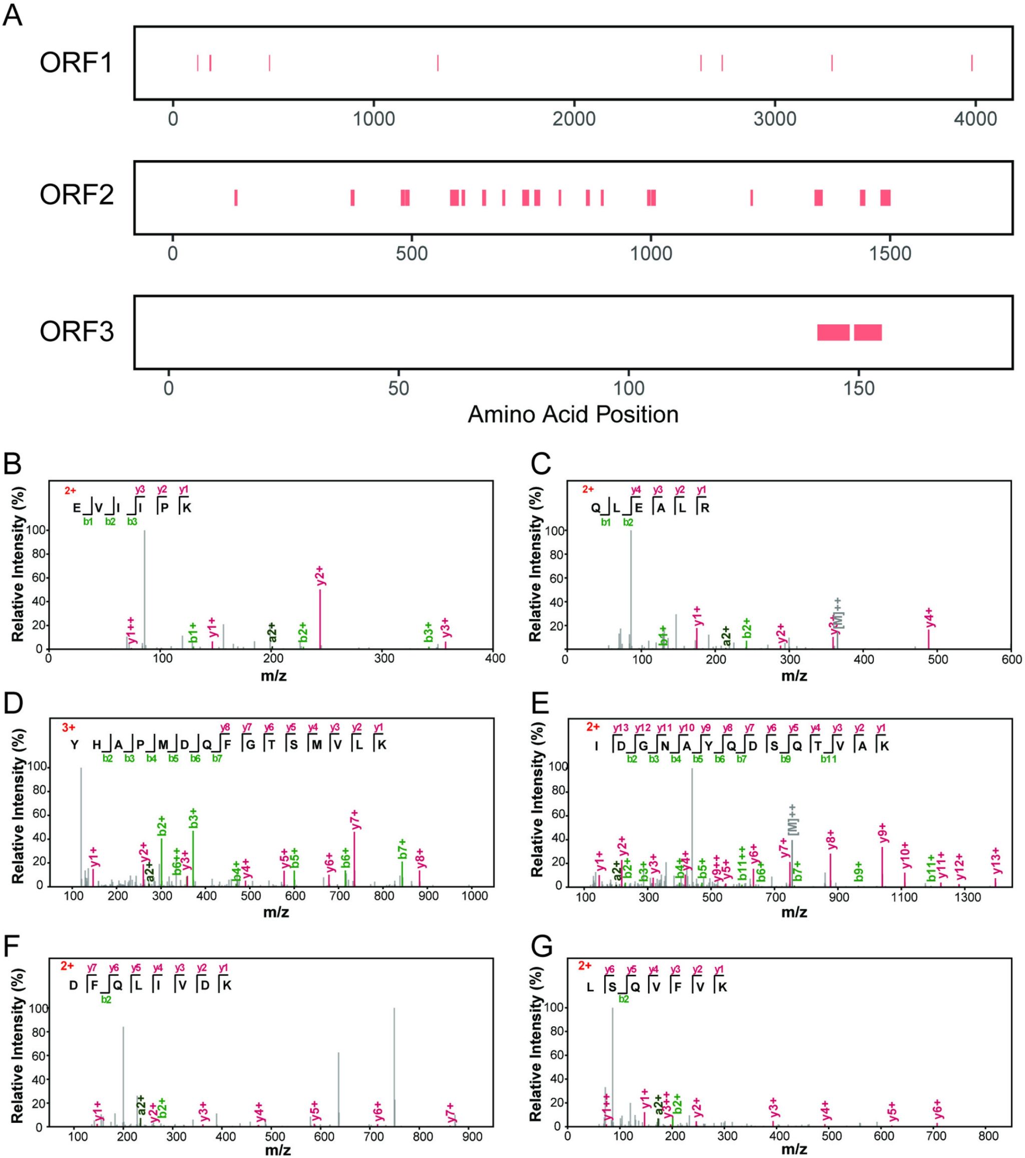 (A)ORF1、ORF2和ORF3蛋白產(chǎn)物的一級序列覆蓋圖,鑒定出的肽段用紅色標(biāo)出。