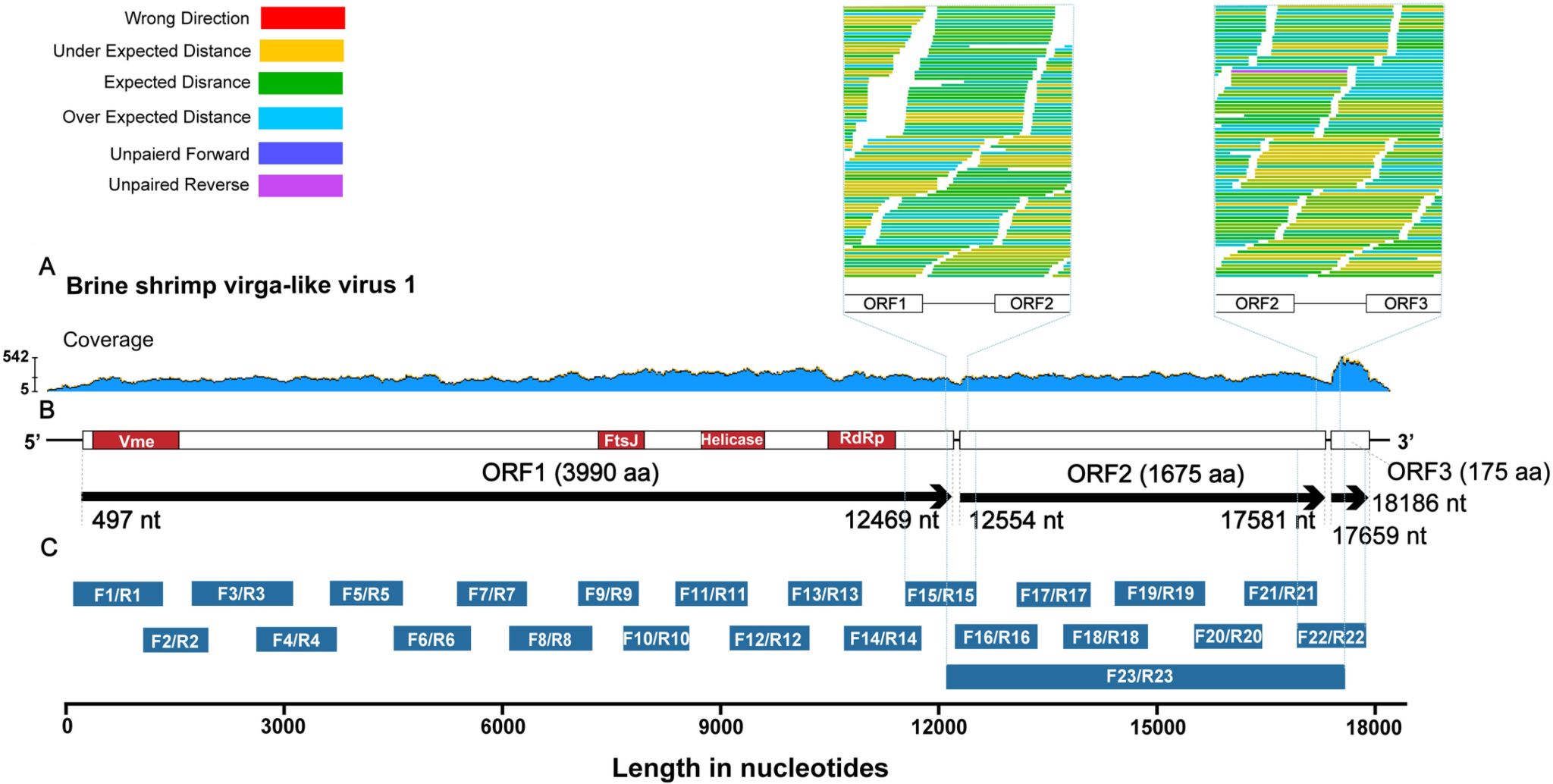 (A)映射到BSVV1參考序列上的宏轉(zhuǎn)錄組測序數(shù)據(jù)??缭絆RF1和ORF2以及跨越ORF2和ORF3的Reads被突出顯示。