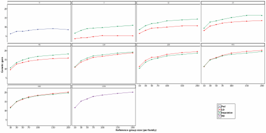 圖2 不同SNP密度和參考群規(guī)模下基因型填充對遺傳進展的影響