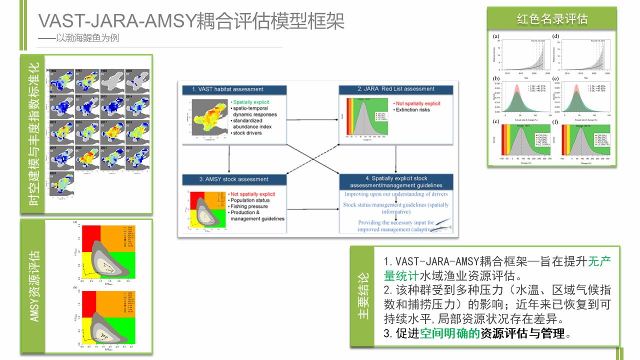 當前,全球漁業(yè)廣泛采用的數(shù)據(jù)需求適中的資源評估模型通常無法輸出資源空間結構信息,導致管理策略難以應對局部資源波動風險。針對這一國際難題,團隊創(chuàng)新性地提出了一個“時空分布-種群評估”耦合模型框架(coupled VAST-JARA-AMSY framework),成功破解了傳統(tǒng)評估模型缺乏空間維度的難題。該研究首次實現(xiàn)了數(shù)據(jù)中度漁業(yè)(data-moderate fisheries)的 “空間-狀態(tài)-風險”聯(lián)動評估,為渤海乃至全球面臨類似數(shù)據(jù)挑戰(zhàn)的漁業(yè)資源管理提供了可復制的工具。