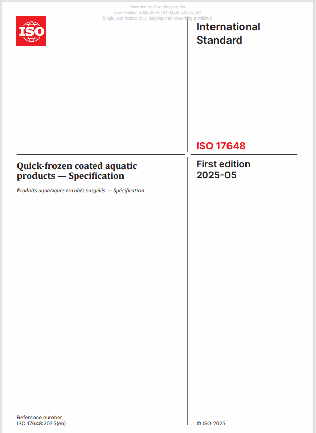 近日,由中國水產(chǎn)科學(xué)研究院黃海水產(chǎn)研究所/全國水產(chǎn)標(biāo)準(zhǔn)化技術(shù)委員會(huì)水產(chǎn)品加工分技術(shù)委員會(huì)牽頭制定的國際標(biāo)準(zhǔn)ISO 17648:2025《速凍裹衣水產(chǎn)制品—產(chǎn)品規(guī)范》(Quick-frozen coated aquatic products—Specification)由國際標(biāo)準(zhǔn)化組織正式批準(zhǔn)發(fā)布。該標(biāo)準(zhǔn)是我國牽頭制定的首個(gè)調(diào)理水產(chǎn)制品國際標(biāo)準(zhǔn),也是繼我國牽頭制定并獲批發(fā)布ISO首個(gè)水產(chǎn)領(lǐng)域國際標(biāo)準(zhǔn)ISO 23855:2021《冷凍魚糜—產(chǎn)品規(guī)范》(Frozen surimi—Specification)之后的又一項(xiàng)新突破。