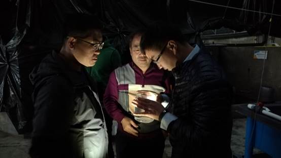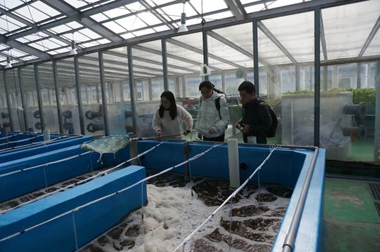 代表團成員參觀海研養(yǎng)殖公司車間并觀察其苗種繁育情況