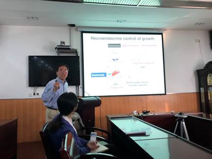 報(bào)告會(huì)上,段存明教授作了題為“魚(yú)類生長(zhǎng)調(diào)控分子機(jī)理的新進(jìn)展”的學(xué)術(shù)報(bào)告,介紹了其研究團(tuán)隊(duì)在斑馬魚(yú)胰島素樣生長(zhǎng)因子結(jié)合蛋白(IGFBP)方面的最新研究進(jìn)展,發(fā)現(xiàn)IGFBP1和IGFBP5a在內(nèi)分泌和鈣離子調(diào)節(jié)方面的新功能,這為系統(tǒng)解析IGFBP在魚(yú)類生長(zhǎng)發(fā)育過(guò)程中的作用提供了新視角和新思路。報(bào)告引起了參會(huì)人員的廣泛興趣,并與段存明教授就相關(guān)問(wèn)題展開(kāi)了深入探討與交流。會(huì)后,段存明教授實(shí)地參觀了水產(chǎn)生物技術(shù)與基因組研究室,與團(tuán)隊(duì)成員圍繞魚(yú)類基因敲除技術(shù)、鲆鰈魚(yú)類生長(zhǎng)等具體問(wèn)題進(jìn)行了溝通與交流。