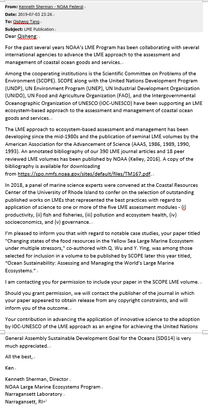 附件:大海洋生態(tài)系之父、86歲高齡的Kenneth Sherman博士致唐啟升院士的郵件,概要介紹了大海洋生態(tài)系發(fā)展歷程、目標、關注點、成果及其相關網址,供學習參考。