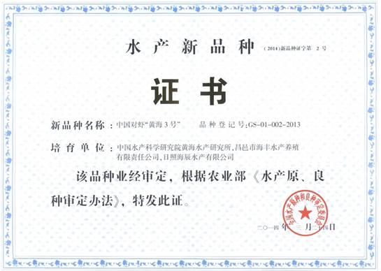 圖1 中國對蝦“黃海3號”新品種證書