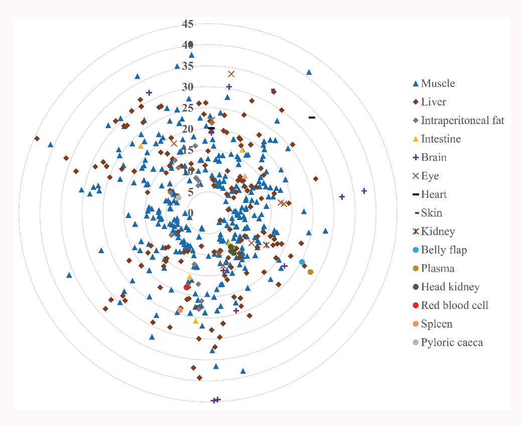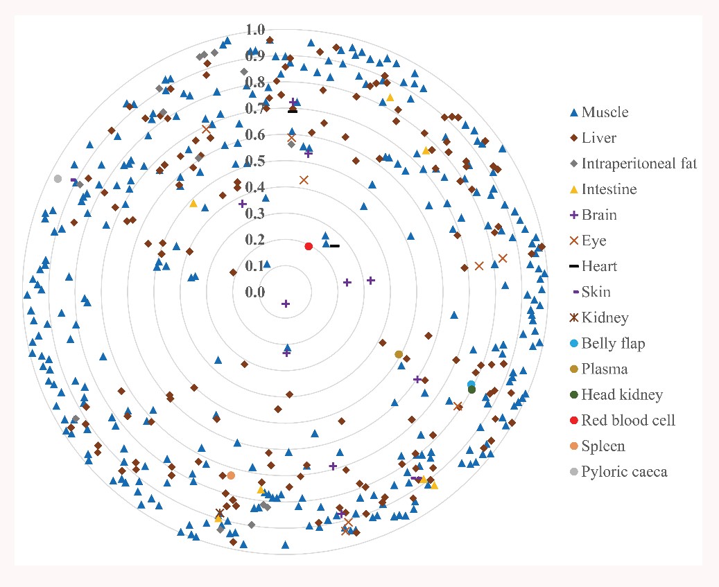 該工作在290篇涉及養(yǎng)殖魚類飼料和魚體脂肪酸組成的代表性文獻(xiàn)基礎(chǔ)上構(gòu)建了“飼料-魚體”脂肪酸組成關(guān)系數(shù)據(jù)庫(kù)。對(duì)數(shù)據(jù)庫(kù)中脂肪酸數(shù)據(jù)進(jìn)行標(biāo)準(zhǔn)化處理后,對(duì)每篇數(shù)據(jù)中單個(gè)脂肪酸的“飼料-魚體”關(guān)系進(jìn)行了4項(xiàng)基礎(chǔ)評(píng)估參數(shù)計(jì)算:(1)Pearson雙尾相關(guān)系數(shù);(2)相對(duì)(處理間)離散度;(3)平均含量;(4)相對(duì)變化量(gain or loss%)。并且,針對(duì)每個(gè)組織構(gòu)建了兩個(gè)綜合評(píng)價(jià)參數(shù)來定量描述其脂肪酸組成同飼料脂肪酸組成的相對(duì)關(guān)系:(1)Coefficient of Distance