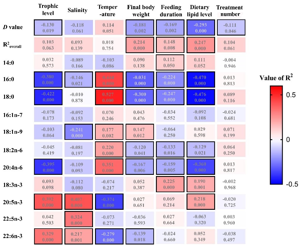 同時(shí),結(jié)合PRIMER-E生態(tài)學(xué)評(píng)估模型中的SIMPER多元相似度分析工具來分析各脂肪酸單體對(duì)飼料和組織脂肪酸組成差異度的貢獻(xiàn)值。隨后,進(jìn)一步將魚體初重、營(yíng)養(yǎng)級(jí)、投喂周期、飼料脂肪水平、養(yǎng)殖過程鹽度和溫度等環(huán)境因子的值同上述評(píng)估參數(shù)進(jìn)行了相關(guān)性分析,以實(shí)現(xiàn)對(duì)這些因素影響“飼料-魚體”脂肪酸關(guān)系的定量評(píng)估。相關(guān)分析結(jié)果以定量化方式系統(tǒng)闡述了“飼料-魚體”脂肪酸組成關(guān)系在不同脂肪酸、不同組織、不同脂質(zhì)類型及不同養(yǎng)殖魚類間的差異,揭示和發(fā)現(xiàn)了魚類脂肪酸沉積過程中諸多新的特征和規(guī)律。該項(xiàng)研究工作為養(yǎng)殖魚類脂肪酸營(yíng)養(yǎng)品質(zhì)評(píng)價(jià)提供了重要的方法學(xué)創(chuàng)新。