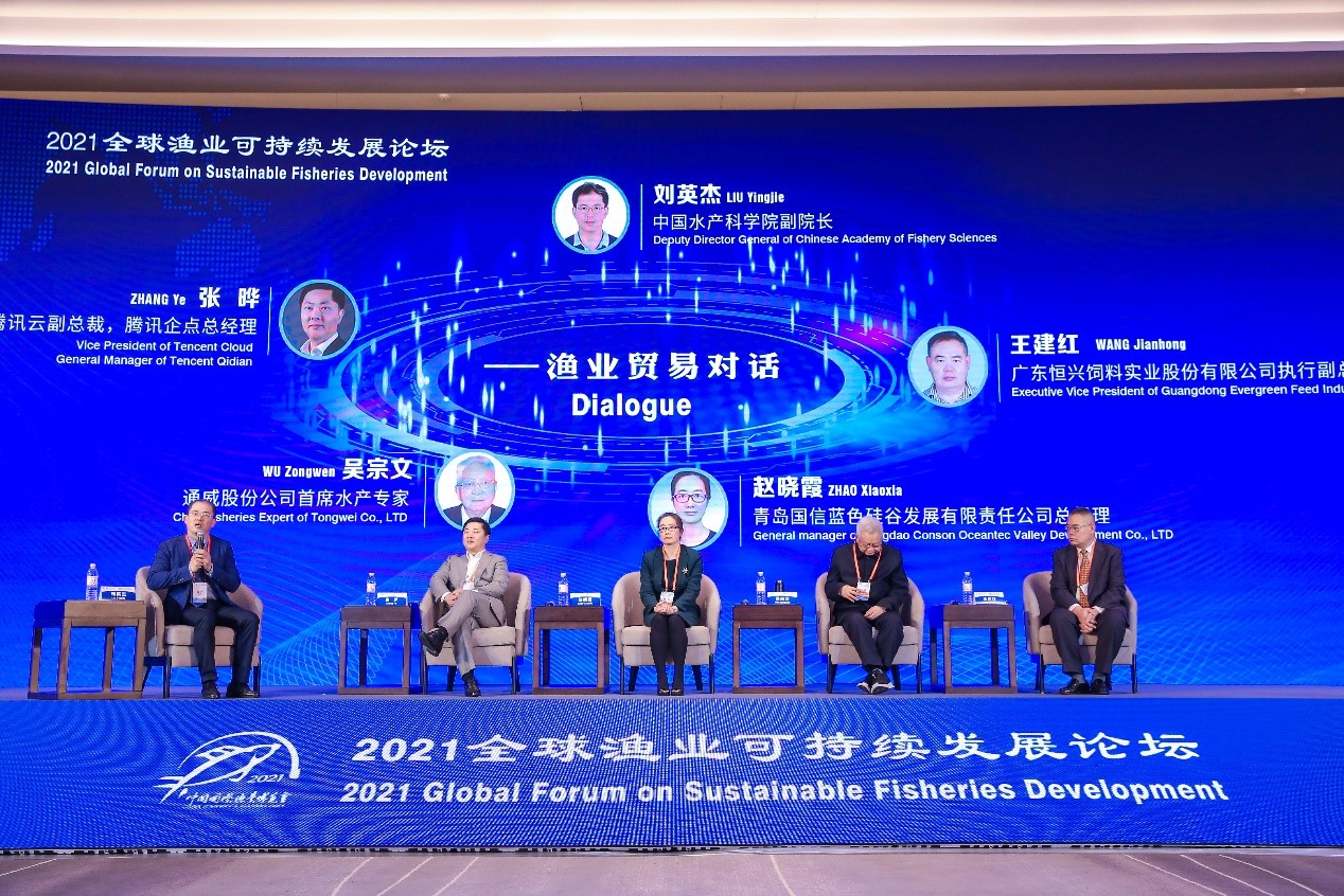 水產(chǎn)貿(mào)易對(duì)話環(huán)節(jié)由中國(guó)水產(chǎn)科學(xué)研究院副院長(zhǎng)劉英杰主持,騰訊云副總裁、騰訊企點(diǎn)總經(jīng)理張曄,青島國(guó)信藍(lán)色硅谷發(fā)展有限責(zé)任公司總經(jīng)理趙曉霞,廣東恒興集團(tuán)有限公司副總裁王建紅,通威股份公司首席水產(chǎn)專家吳宗文等企業(yè)家圓桌對(duì)話,就新形勢(shì)下全球水產(chǎn)品貿(mào)易形式特點(diǎn)、存在的問(wèn)題與產(chǎn)業(yè)展望進(jìn)行經(jīng)驗(yàn)分享,從數(shù)字化助力產(chǎn)業(yè)轉(zhuǎn)型升級(jí)、突破性工船養(yǎng)殖引領(lǐng)生產(chǎn)、智能“漁光一體”園區(qū)模式創(chuàng)新、承建產(chǎn)業(yè)園區(qū)拓展海外市場(chǎng)等研、產(chǎn)、銷多方面為水產(chǎn)業(yè)實(shí)現(xiàn)多功能、多效應(yīng)的現(xiàn)代化轉(zhuǎn)型升級(jí)貢獻(xiàn)思路和方案。