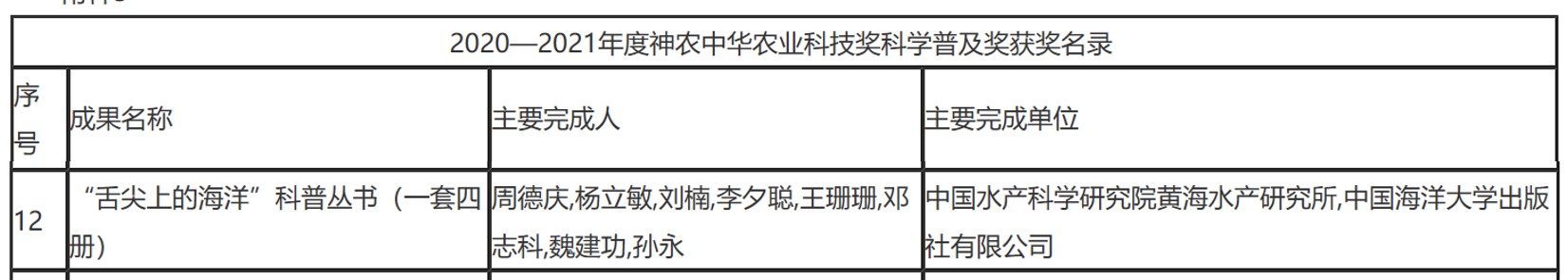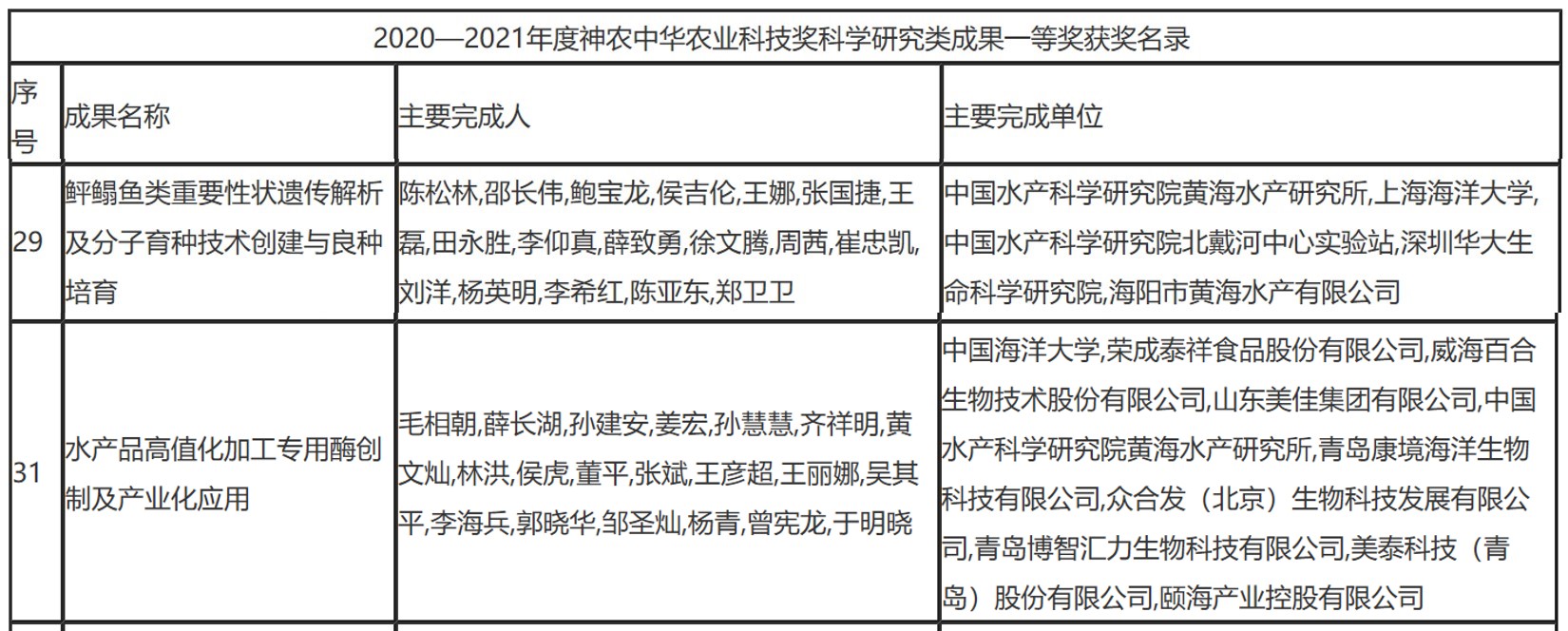 11月1日,農業(yè)農村部發(fā)布關于2020-2021年度神農中華農業(yè)科技獎的表彰決定(農科教發(fā)〔2021〕10號)。中國水產科學研究院黃海水產研究所陳松林研究員主持完成的“鲆鰨魚類重要性狀遺傳解析及分子育種技術創(chuàng)建與良種培育”獲神農中華農業(yè)科技獎科學研究類成果一等獎,周德慶研究員主持完成的“《舌尖上的海洋》科普叢書(一套四冊)”獲神農中華農業(yè)科技獎科學普及獎,孫慧慧副研究員參與完成的“水產品高值化加工專用酶創(chuàng)制及產業(yè)化應用”成果(第五完成人)獲神農中華農業(yè)科技獎科學研究類成果一等獎。