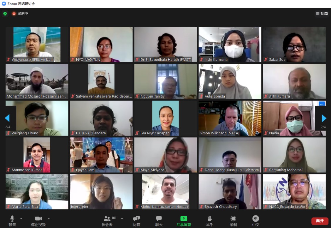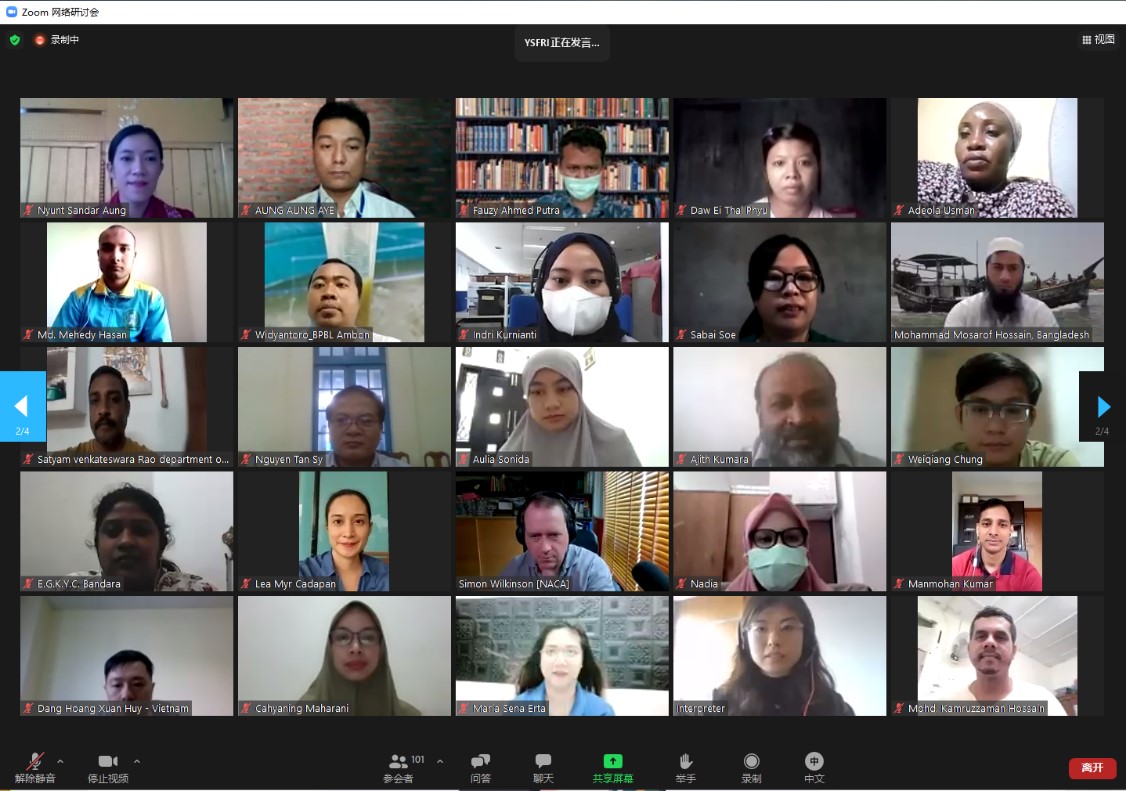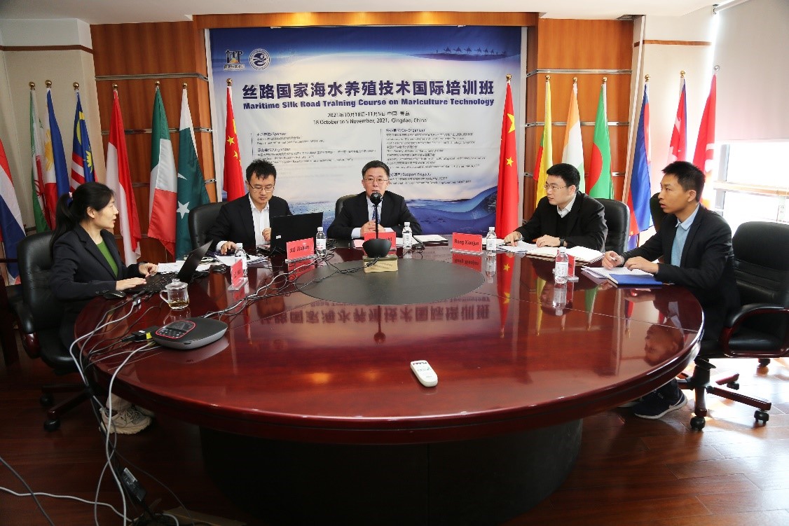 來自黃海水產(chǎn)研究所、中國水產(chǎn)學(xué)會和NACA的43位海水養(yǎng)殖領(lǐng)域?qū)<夜餐谡n,課程內(nèi)容包括水產(chǎn)養(yǎng)殖發(fā)展概論、水產(chǎn)養(yǎng)殖品種繁育與養(yǎng)殖技術(shù)、水產(chǎn)養(yǎng)殖模式與設(shè)施裝備、水產(chǎn)病害防控、水產(chǎn)品高值加工等,來自孟加拉、印度、印度尼西亞、巴基斯坦、秘魯、斯里蘭卡、越南等7個國家和地區(qū)的學(xué)員介紹了各自國家的水產(chǎn)養(yǎng)殖發(fā)展概況。10月27日,培訓(xùn)班全體學(xué)員還以線上方式參加了由黃海水產(chǎn)研究所和農(nóng)業(yè)農(nóng)村部農(nóng)業(yè)貿(mào)易中心共同主辦的2021全球漁業(yè)可持續(xù)發(fā)展論壇。