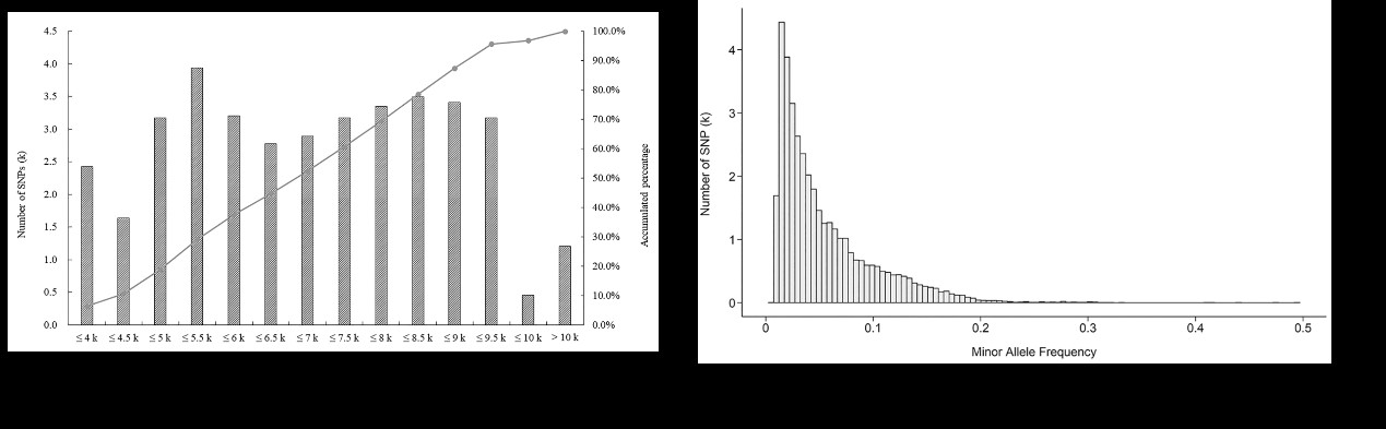 魚(yú)類(lèi)種質(zhì)資源與分子育種創(chuàng)新團(tuán)隊(duì)在前期完成1000多個(gè)半滑舌鰨個(gè)體全基因組重測(cè)序的基礎(chǔ)上,自主設(shè)計(jì)了SNP位點(diǎn)篩選策略,整合了抗哈維氏弧病、生長(zhǎng)等性狀相關(guān)位點(diǎn),選取38295個(gè)SNP,聯(lián)合Affymetrix公司研制了基因芯片“鰨芯1號(hào)”,建立了基于基因芯片的半滑舌鰨抗病基因組選擇育種技術(shù),并應(yīng)用于抗細(xì)菌病良種選育,為抗病良種培育提供了技術(shù)支撐。相關(guān)成果在Genomics發(fā)表。