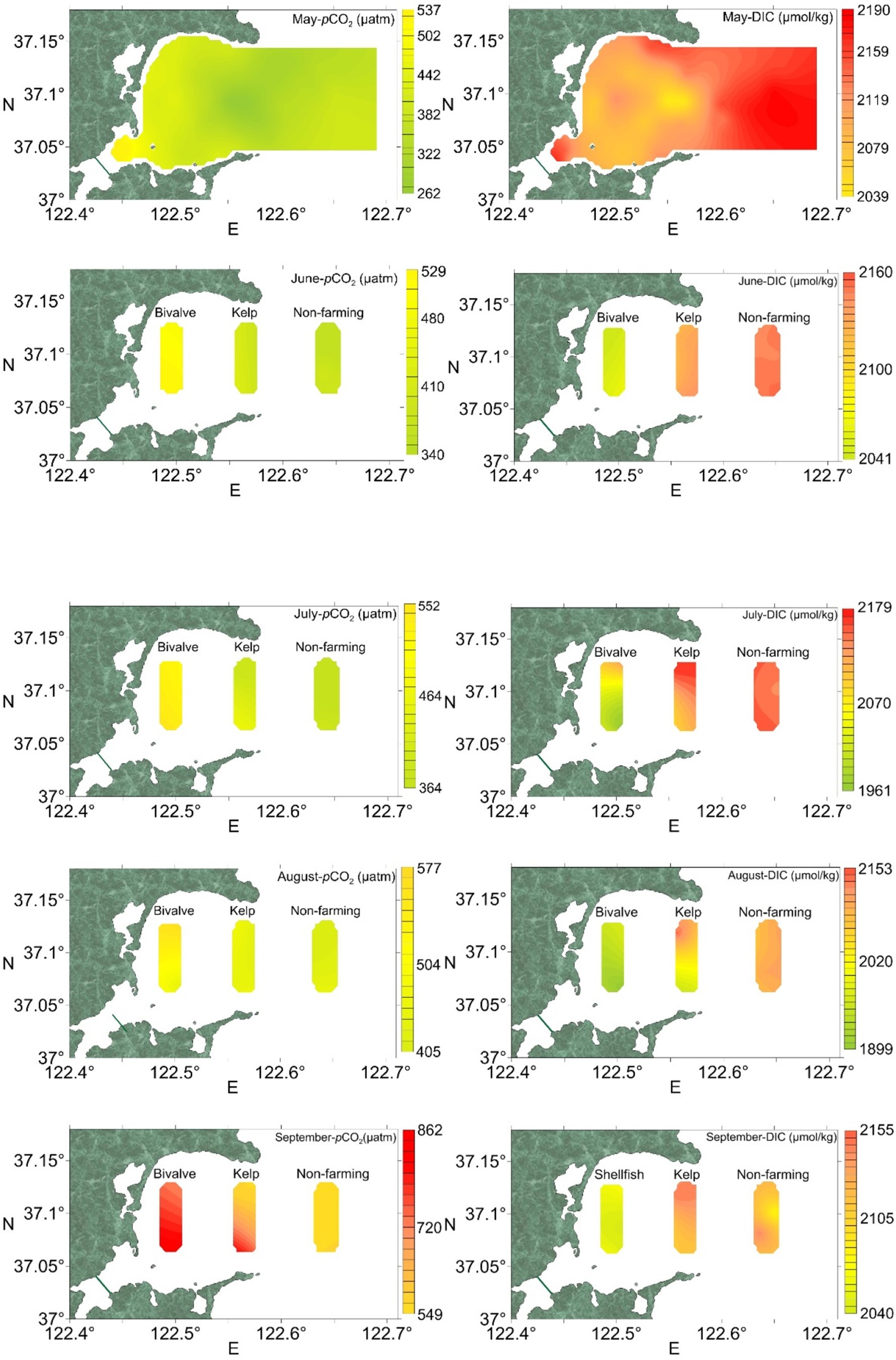 5-9月桑溝灣不同養(yǎng)殖區(qū)(貝類(lèi)和海帶養(yǎng)殖區(qū))和灣外(非養(yǎng)殖區(qū))的表層海水的pCO2(μatm)和溶解無(wú)機(jī)碳(DIC)(μmol·kg-1)的等值線圖。