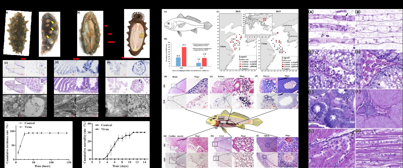 黃海水產(chǎn)研究所甲殼類(lèi)流行病學(xué)與疫病防控創(chuàng)新團(tuán)隊(duì)研究發(fā)現(xiàn),蝦類(lèi)偷死野田村病毒(CMNV)可跨物種自然感染刺參(Apostichopus japonicus)、斑馬魚(yú)(Danio rerio)和小黃魚(yú)(Larimichthys polyactis),十足目虹彩病毒(DIV1)可自然或人工感染三疣梭子蟹。CMNV感染會(huì)導(dǎo)致刺參腸道、呼吸樹(shù)及性腺等器官發(fā)生核固縮、空泡化等組織病變,對(duì)養(yǎng)殖刺參具有較強(qiáng)的致病性;CMNV在自然條件下能感染斑馬魚(yú)、小黃魚(yú)并引起染病個(gè)體肝臟、腎臟、脾臟、心臟和卵巢等器官出現(xiàn)較嚴(yán)重的病理?yè)p傷。DIV1可自然感染三疣梭子蟹,染病個(gè)體活力下降、反應(yīng)遲緩、厭食。CMNV和DIV1作為養(yǎng)殖甲殼類(lèi)新發(fā)疫病病原,已分別被亞太水產(chǎn)養(yǎng)殖中心網(wǎng)絡(luò)(NACA)和世界動(dòng)物衛(wèi)生組織(OIE)收錄為需通報(bào)的甲殼動(dòng)物疫病病原,它們展現(xiàn)的跨物種感染能力提示其危害范圍可能會(huì)進(jìn)一步擴(kuò)大,危害我國(guó)和全球水產(chǎn)養(yǎng)殖業(yè)。研究成果共發(fā)表1區(qū)SCI論文4篇,二區(qū)SCI論文2篇。