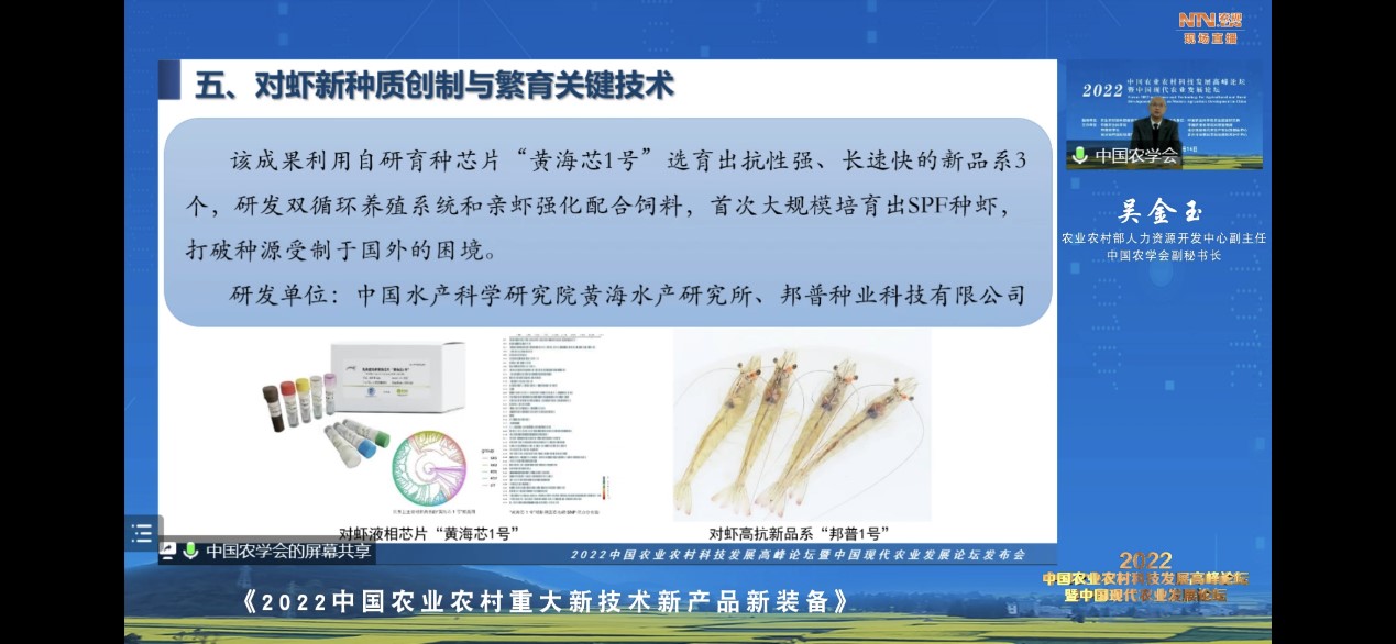 近日,在2022中國(guó)農(nóng)業(yè)農(nóng)村科技發(fā)展高峰論壇暨中國(guó)現(xiàn)代農(nóng)業(yè)發(fā)展論壇上,中國(guó)農(nóng)學(xué)會(huì)正式發(fā)布2022年度中國(guó)農(nóng)業(yè)農(nóng)村重大新技術(shù)新產(chǎn)品新裝備,共有35項(xiàng)新成果入選,涵蓋新技術(shù)10項(xiàng)、新產(chǎn)品13個(gè)、新裝備12件。中國(guó)水產(chǎn)科學(xué)研究院黃海水產(chǎn)研究所牽頭完成的“對(duì)蝦新種質(zhì)創(chuàng)制與繁育關(guān)鍵技術(shù)”入選重大新技術(shù)。