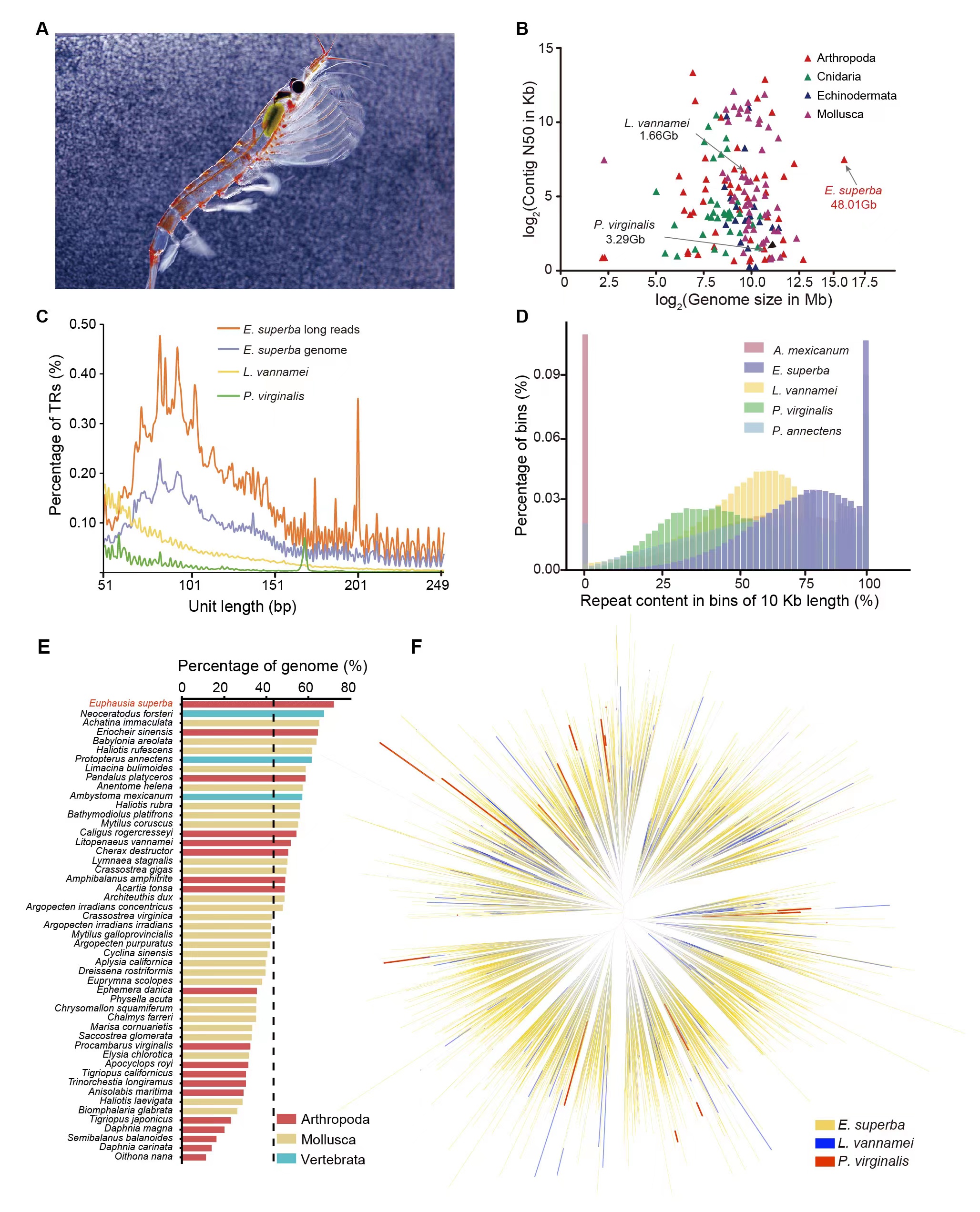 該研究利用新一代測序技術對南極磷蝦開展了高深度的基因組測序、組裝和分析,構建了迄今為止地球上最大的動物基因組參考序列(圖1),其大小為48Gb,約為人類基因組的16倍。研究發(fā)現南極磷蝦基因組中重復序列含量高達92.45%,這源于南極磷蝦基因組重復序列的兩次爆發(fā)式擴張,這也是目前為止已報道的基因組重復序列含量最高的物種。