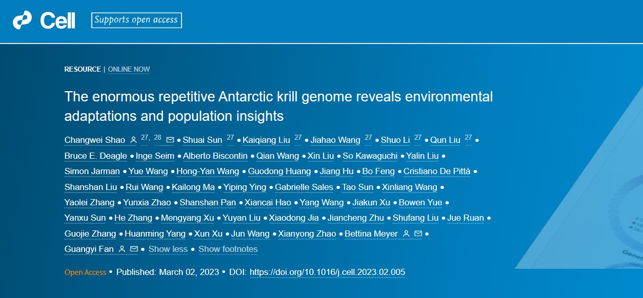中國水產科學研究院黃海水產研究所(以下簡稱“黃海水產研究所”)海水養(yǎng)殖生物育種與可持續(xù)產出全國重點實驗室在南極磷蝦超大基因組組裝、極端環(huán)境適應和群體歷史演化研究方面取得突破性進展。研究成果以“The enormous repetitive Antarctic krill genome reveals environmental adaptations and population insights”為題于3月2日發(fā)表于國際頂級期刊CELL(《細胞》)。