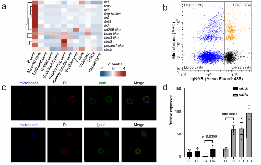 進(jìn)一步對(duì)B細(xì)胞亞型鑒定分析,研究發(fā)現(xiàn)軟骨魚和硬骨魚具有相同的B細(xì)胞亞群,而且不同物種相同亞群具有較高相似性。在軟骨魚中,發(fā)現(xiàn)部分B細(xì)胞具有吞噬功能,進(jìn)一步通過熒光微球吞噬實(shí)驗(yàn)結(jié)合共聚焦和流式細(xì)胞分析,明確了軟骨魚B細(xì)胞的吞噬功能。對(duì)T細(xì)胞亞群進(jìn)行分析,不僅鑒定了潛在的CD4+T細(xì)胞亞群,還意外發(fā)現(xiàn)了一個(gè)同時(shí)表達(dá)T細(xì)胞與B細(xì)胞標(biāo)記基因的細(xì)胞亞群。