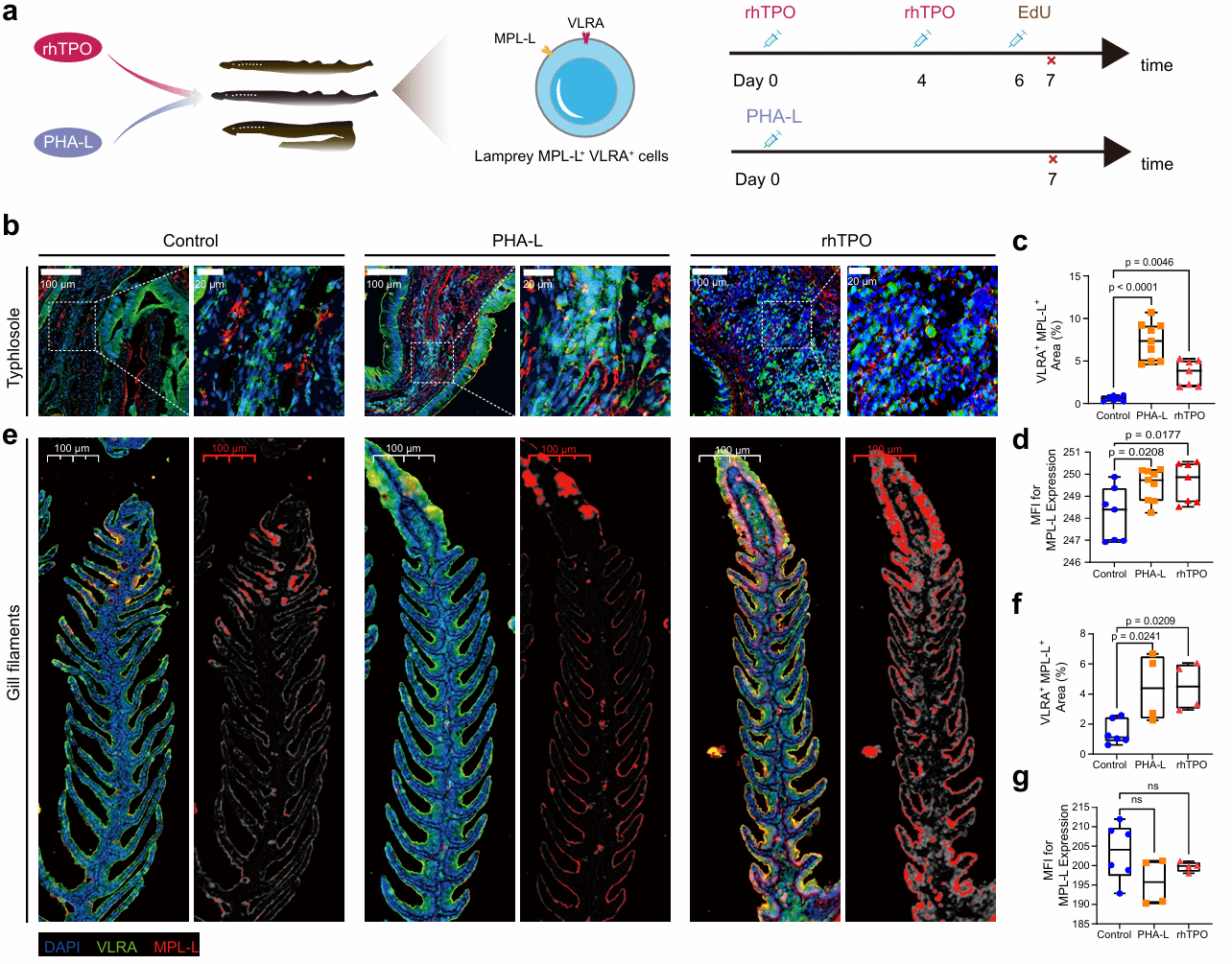 研究人員進(jìn)一步探究了MPL-L+ T樣細(xì)胞的功能特性和進(jìn)化特征。研究發(fā)現(xiàn),MPL-L+ T樣細(xì)胞是無頜脊椎動(dòng)物適應(yīng)性免疫系統(tǒng)中的一個(gè)獨(dú)特群體,這些細(xì)胞的轉(zhuǎn)錄特征與傳統(tǒng)的T細(xì)胞不同,并且能夠在一定程度上響應(yīng)頜骨動(dòng)物T細(xì)胞有絲分裂原和重組人血小板生成素(rhTPO)而增殖。