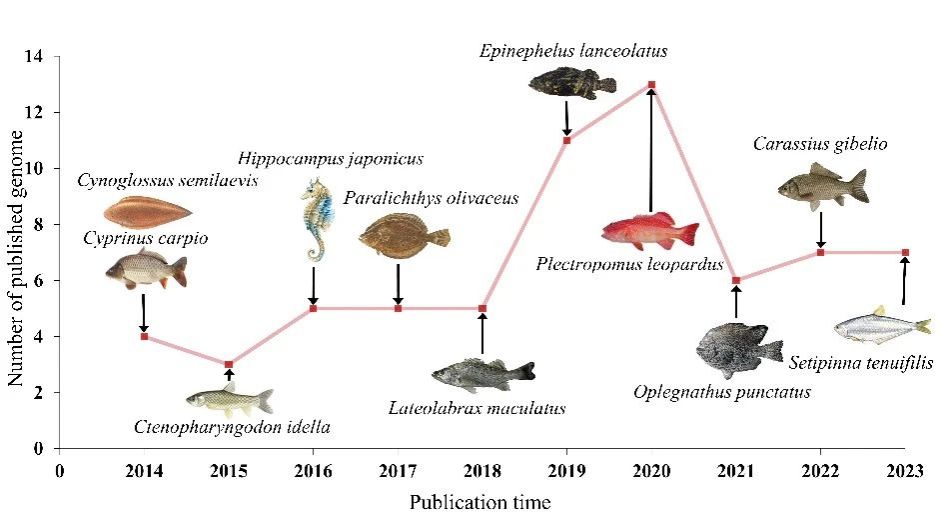2014-2023年中國發(fā)表的魚類基因論文數(shù)目(圖中顯示每年發(fā)表的代表性物種)