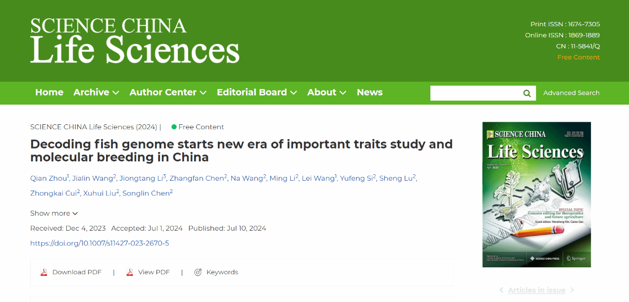 近日,Science China Life Sciences雜志在線發(fā)表了中國水產(chǎn)科學研究院黃海水產(chǎn)研究所陳松林院士團隊題為“Decoding fish genome starts new era of important traits study and molecular breeding in China”的綜述。該綜述總結(jié)了中國在魚類基因組研究和分子育種領(lǐng)域取得的重要進展,并對未來的研究方向進行了展望和探討。
