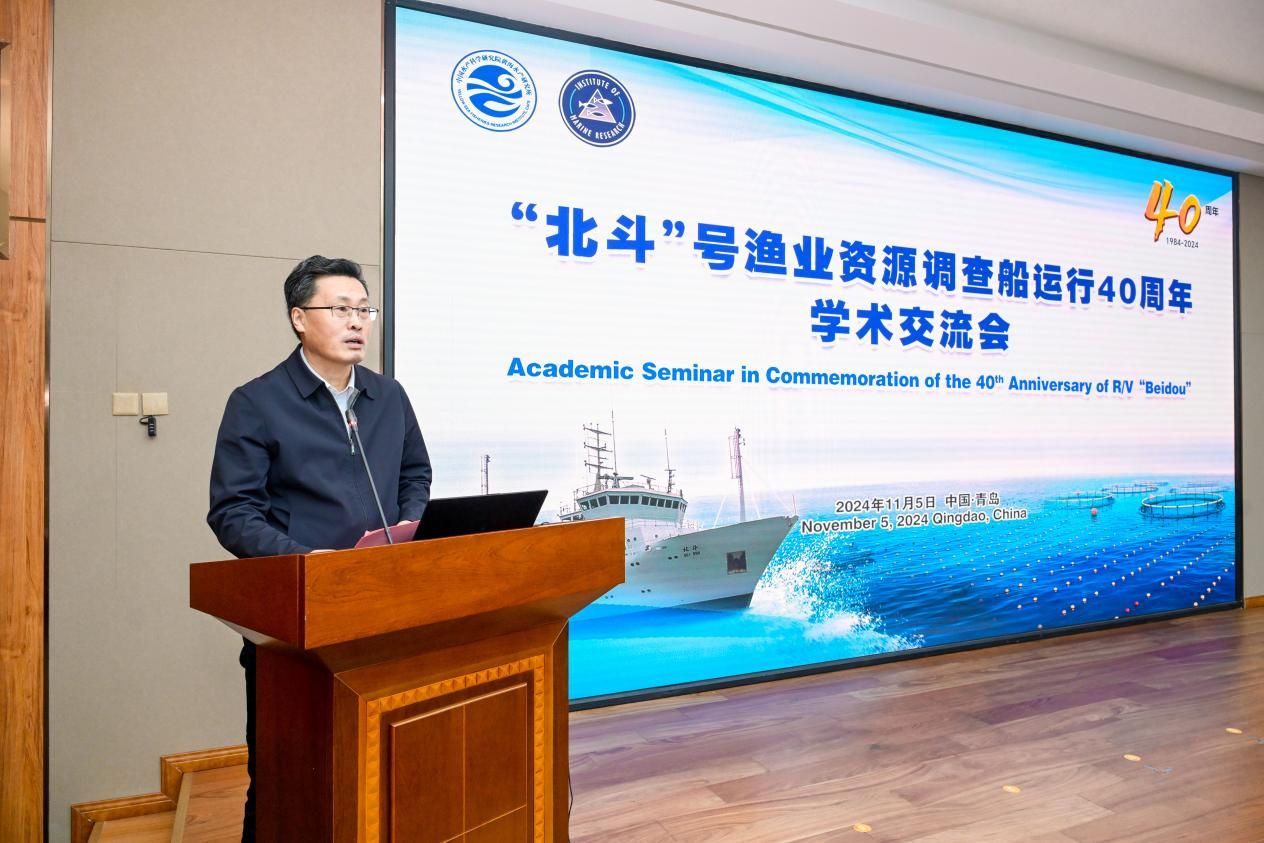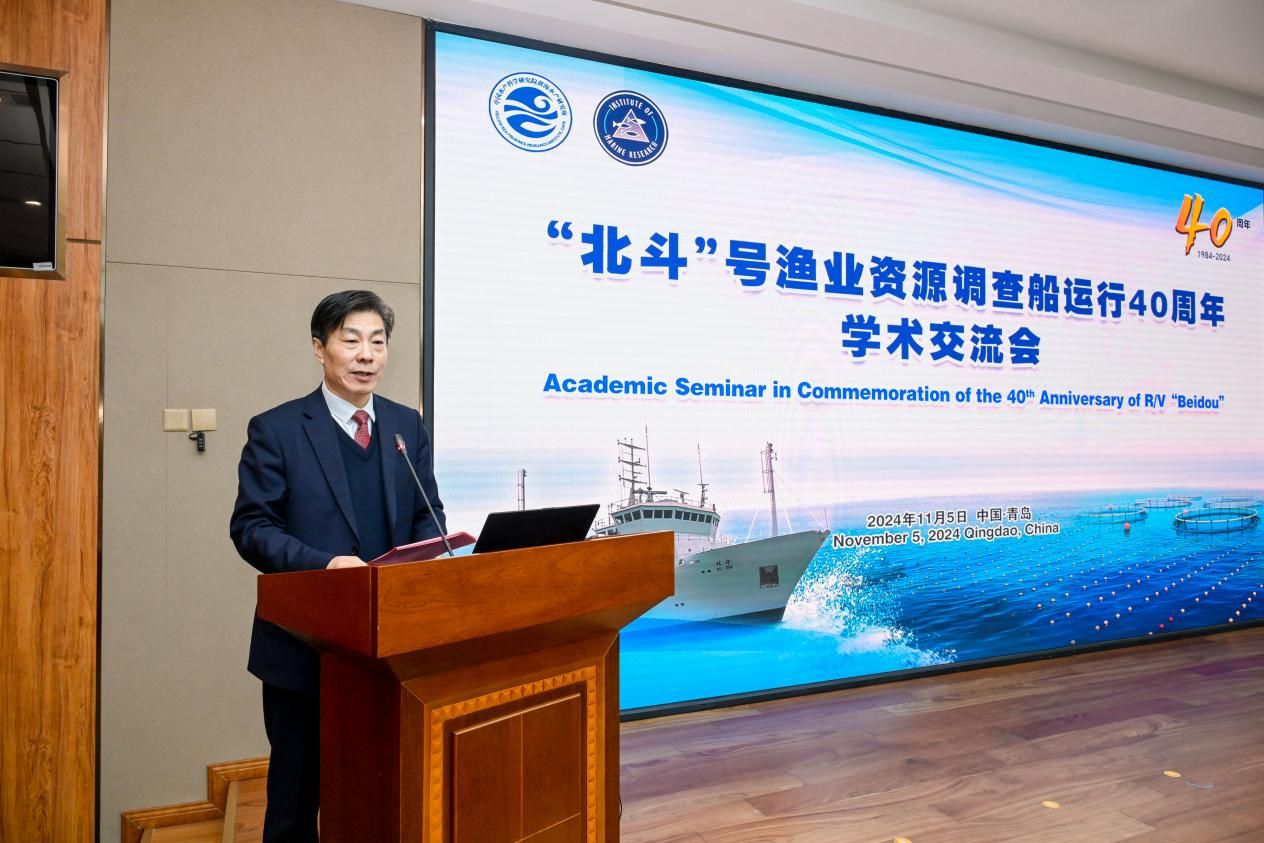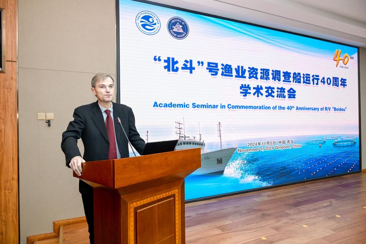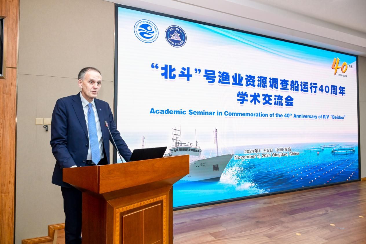 11月5日,“北斗”號漁業(yè)資源調(diào)查船運行40周年學(xué)術(shù)交流活動在青島成功舉辦。挪威駐華大使館發(fā)展參贊尤亞,挪威海洋研究所戰(zhàn)略所長彼得·莫斯比·霍根應(yīng)邀參會,山東省農(nóng)業(yè)農(nóng)村廳總農(nóng)藝師郭鵬、青島市海洋發(fā)展局總工程師張惠珺、青島市科學(xué)技術(shù)協(xié)會副主席柳本才、青島市歸國華僑聯(lián)合會黨組書記張毅等相關(guān)部門領(lǐng)導(dǎo)蒞臨指導(dǎo),嶗山實驗室海洋大科學(xué)設(shè)施部業(yè)務(wù)負責人孫高祚、中國科學(xué)院海洋研究所副所長沙忠利、自然資源部第一海洋研究所副所長王宗靈、中國水產(chǎn)科學(xué)研究院東海水產(chǎn)研究所所長方輝、中國水產(chǎn)科學(xué)研究院南海水產(chǎn)研究所黨委書記程潔、榮成楮島水產(chǎn)有限公司董事長王軍威、青島卓越海洋集團有限公司董事長劉云鋒等涉海科研單位領(lǐng)導(dǎo)及企業(yè)負責人蒞會交流,黃海所全體領(lǐng)導(dǎo)班子成員、中國工程院院士唐啟升、中國工程院院士陳松林出席活動?;顒佑牲S海所黨委書記趙憲勇,副所長葉乃好、邵長偉以及挪威海洋研究所歐文·斯特蘭德研究員輪流主持。
