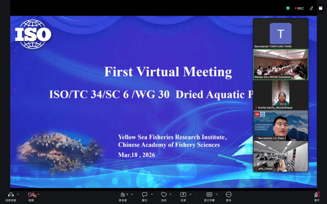 18時(shí)至21時(shí),ISO/TC34/SC6 WG 30第一次國(guó)際工作組會(huì)議以線(xiàn)上形式召開(kāi),來(lái)自中國(guó)、日本、斯里蘭卡、哈薩克斯坦、烏干達(dá)等國(guó)家以及ISO/TC34/SC6秘書(shū)處的10余位國(guó)際專(zhuān)家參會(huì)。會(huì)議由WG 30召集人朱文嘉主持,ISO/TC34/SC6委員會(huì)秘書(shū)長(zhǎng)劉振宇出席并致辭。會(huì)議圍繞ISO/AWI 26260《干海參 產(chǎn)品規(guī)范》國(guó)際標(biāo)準(zhǔn)草案及新工作項(xiàng)目(NP)階段收到的各國(guó)意見(jiàn)展開(kāi)討論,并達(dá)成共識(shí),同意推進(jìn)該草案進(jìn)入下一階段。