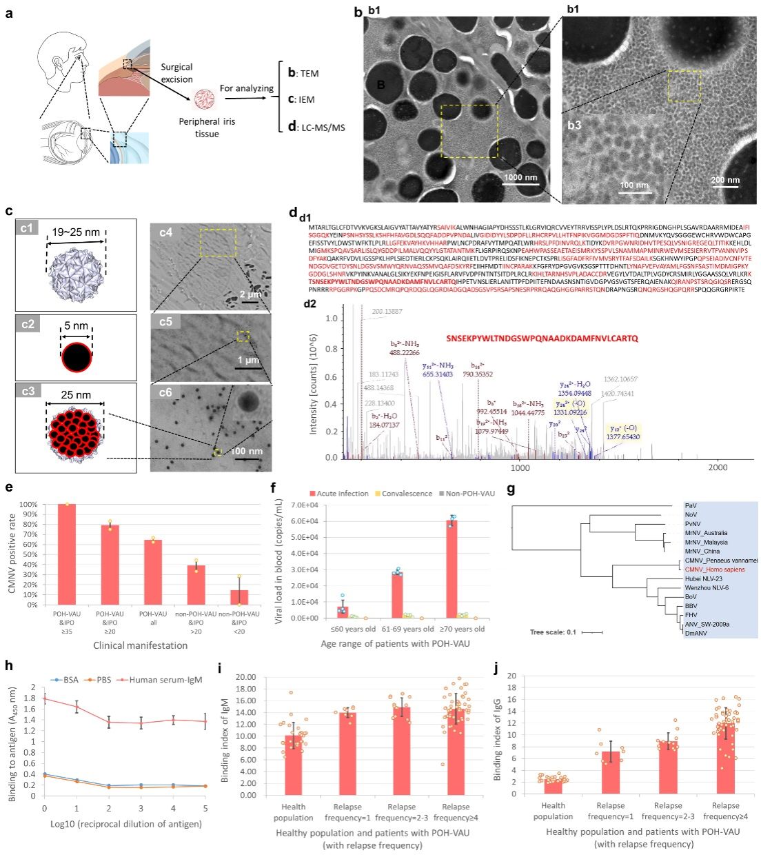 研究團隊聚焦于臨床一種新發(fā)、病因不明的“持續(xù)性高眼壓病毒性前葡萄膜炎(POH-VAU)”,其臨床表現(xiàn)為反復(fù)發(fā)作的輕度前葡萄膜炎、藥物難以控制的持續(xù)性高眼壓(部分患者眼壓逾50 mmHg)、角膜后少量沉著物(KPs)及視神經(jīng)損傷。此前由于常規(guī)療法效果不佳,其病因始終未能查明。研究人員利用透射電鏡、免疫電鏡及高靈敏技術(shù)(LC-MS/MS和qPCR),在患者手術(shù)切除的虹膜組織中成功鑒定到了CMNV病毒顆粒及其特異性蛋白序列,與已知CMNV蛋白序列同源性高達98.96%。隨后的血清學(xué)研究進一步揭示,在受訪的70名確診患者血液中,均檢測到CMNV特異性IgM和IgG抗體轉(zhuǎn)化;且患者體內(nèi)病毒載量與其眼壓水平呈顯著正相關(guān)。這一系列發(fā)現(xiàn)從病原學(xué)和免疫學(xué)角度證實了CMNV感染與該新型眼病直接關(guān)聯(lián)。
