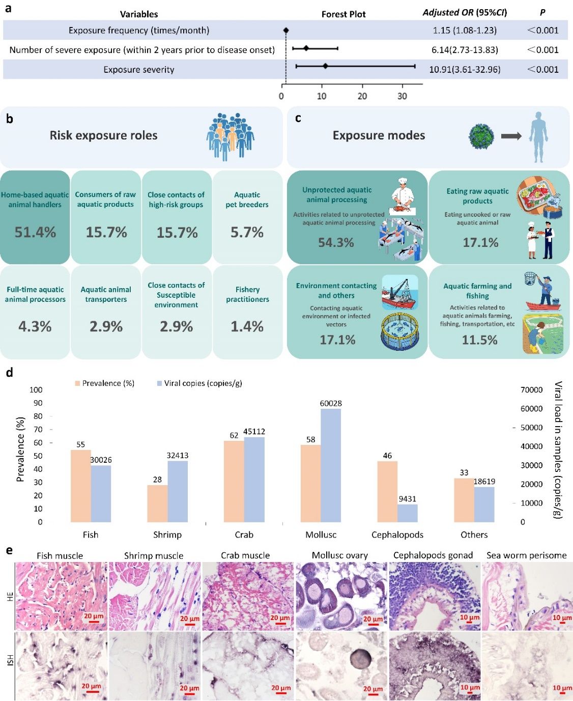 為探究病毒的傳播途徑,研究團隊深入開展了流行病學(xué)調(diào)查、病例對照研究及回歸模型分析。結(jié)果顯示,“無防護處理水產(chǎn)動物”(如在宰殺、清洗過程中被刺傷)和“生食水產(chǎn)品”是兩大主要暴露途徑,占到調(diào)查病例的71.4%。調(diào)查還發(fā)現(xiàn),伴有皮膚破損的嚴重暴露是導(dǎo)致發(fā)病的獨立危險因素。研究進一步揭示,在高風險暴露后,該病的潛伏期通常在3個月以內(nèi),且感染后的病情往往更加嚴重。