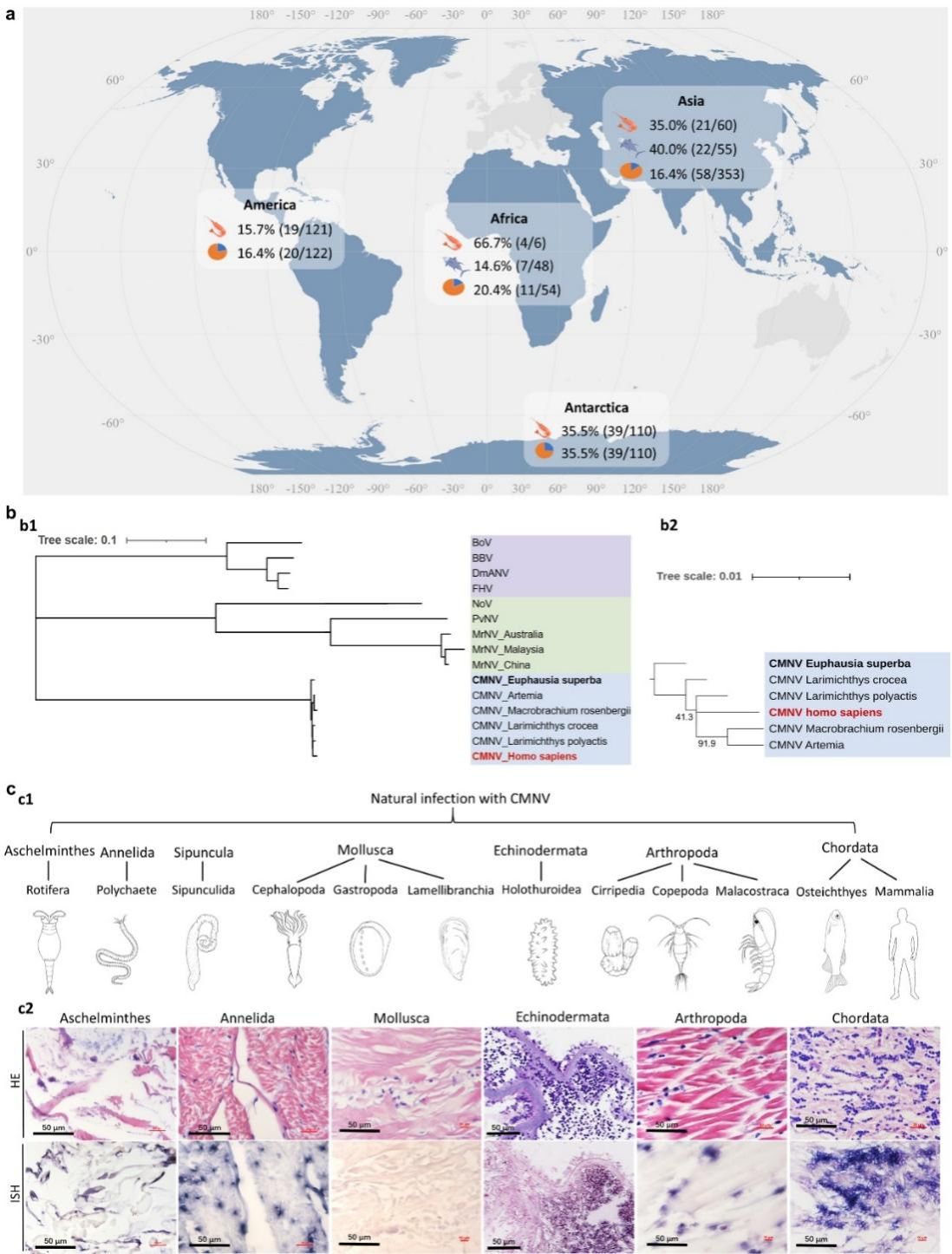 此外,全球范圍的分子流行病學(xué)調(diào)查揭示出,CMNV病毒在亞洲、美洲、歐洲、非洲及南極洲的養(yǎng)殖和野生水生動物體內(nèi)廣泛存在。在南極磷蝦樣本中,該病毒的陽性率高達35.5%,其宿主范圍橫跨了甲殼亞門和脊椎動物亞門等10個動物亞門。系統(tǒng)發(fā)育分析顯示,從南極磷蝦中分離的CMNV毒株處于進化樹的基部(根部)。結(jié)合極高的流行率,研究團隊推測,南極磷蝦極可能是CMNV的原始自然宿主。這預(yù)示著該病毒在海洋生態(tài)系統(tǒng)中擁有古老的進化歷史,并具備廣泛的宿主適應(yīng)性。