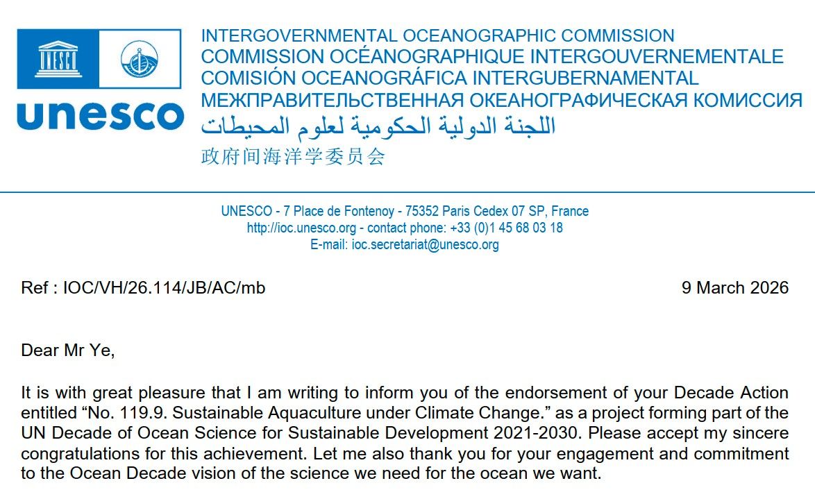 近日,由中國水產(chǎn)科學(xué)研究院黃海水產(chǎn)研究所海水養(yǎng)殖生物育種與可持續(xù)產(chǎn)出全國重點(diǎn)實(shí)驗(yàn)室葉乃好研究員牽頭組織的國際合作研究計(jì)劃——“氣候變化下的可持續(xù)水產(chǎn)養(yǎng)殖”(Sustainable Aquaculture under Climate Change, SACC),正式獲聯(lián)合國教科文組織政府間海洋學(xué)委員會(huì)(IOC/UNESCO)批準(zhǔn),納入聯(lián)合國“海洋科學(xué)促進(jìn)可持續(xù)發(fā)展十年”(Ocean Decade, 2021–2030)(以下簡稱“海洋十年”)行動(dòng)計(jì)劃。該計(jì)劃歷時(shí)5年籌備,聯(lián)合阿根廷、澳大利亞、比利時(shí)、貝寧、智利、法國、荷蘭、墨西哥、馬來西亞、挪威、俄羅斯、泰國、美國、越南、馬耳他等16個(gè)國家21家科研機(jī)構(gòu)以及全球可持續(xù)水產(chǎn)養(yǎng)殖推進(jìn)伙伴關(guān)系(GSAAP)共同發(fā)起,旨在通過跨國協(xié)作推動(dòng)全球水產(chǎn)養(yǎng)殖體系在氣候變化背景下實(shí)現(xiàn)綠色轉(zhuǎn)型與可持續(xù)發(fā)展。