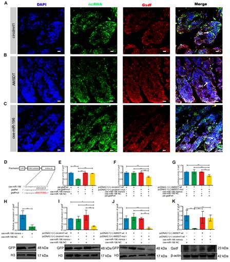 circdmrt1 and AMSDT relieve the repressive effect of cse-miR-196 on gsdf mRNA and protein.
