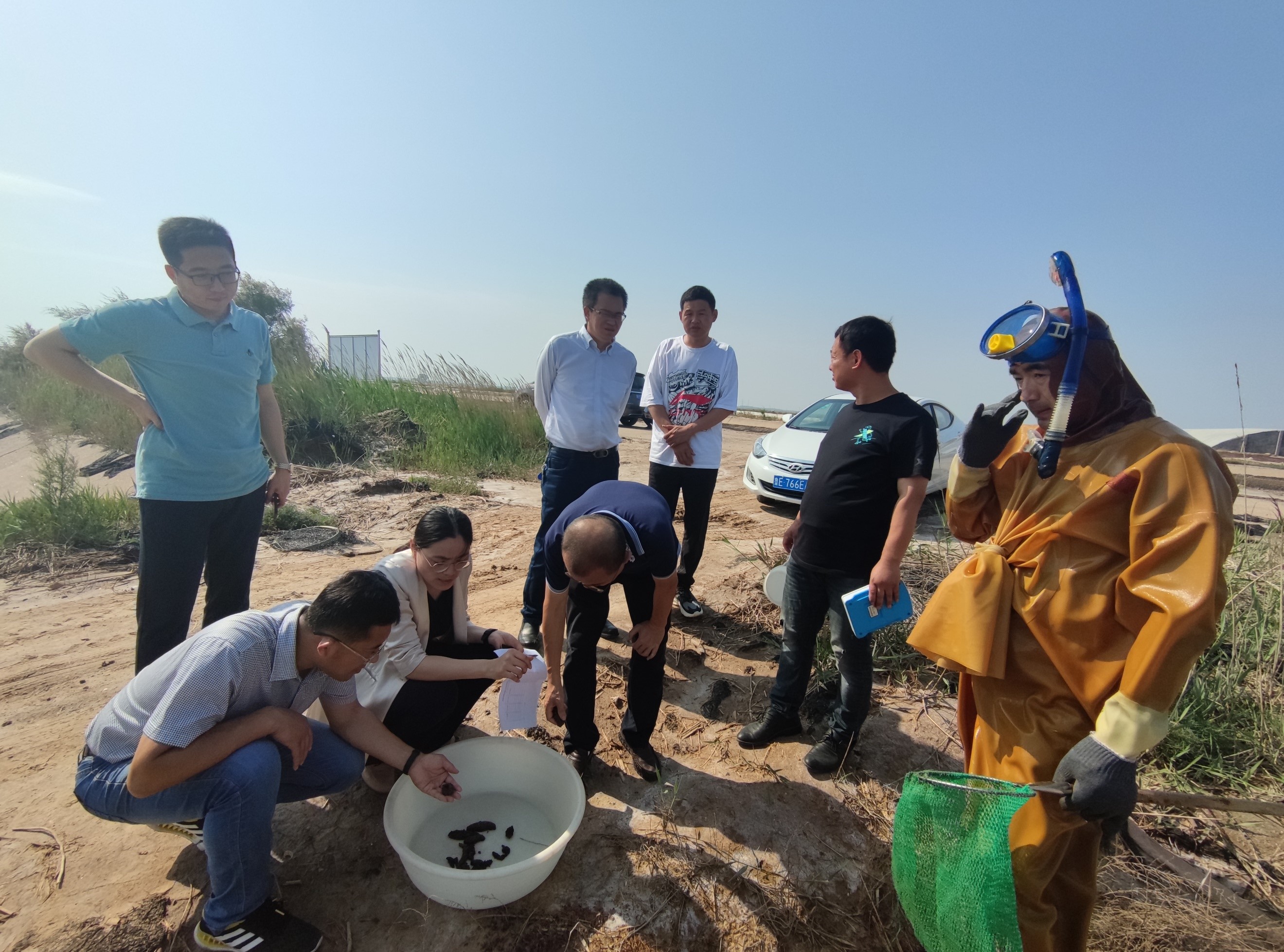 6月8日,中國水產科學研究院黃海水產研究所邀請專家在東營海躍水產科技有限公司(以下簡稱“東營海躍”)對國家重點研發(fā)計劃課題“刺參、海膽良種高效制種與苗種擴繁技術”(2018YFD0901603)中的“刺參陸基池塘大規(guī)格苗種規(guī)?;嘤夹g”任務進行了現(xiàn)場驗收。驗收專家組由中國科學院海洋研究所、中國海洋大學、中國水產科學研究院、青島科技大學和青島農業(yè)大學等單位的專家組成。