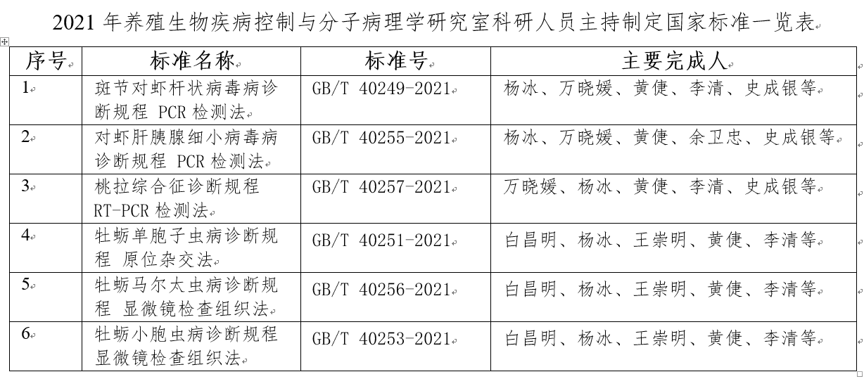 黃海水產(chǎn)研究所養(yǎng)殖生物疾病控制與分子病理學(xué)研究室長期致力于水生動物疫病的研究和標(biāo)準(zhǔn)化建設(shè)工作,為支撐全國水生動物病防體系建設(shè)做出了貢獻(xiàn)。研究室2011年被指定為世界動物衛(wèi)生組織(OIE)對蝦白斑綜合征(WSD)、傳染性皮下和造血組織壞死病參考實驗室,在對蝦病原檢測、診斷試劑提供、技術(shù)咨詢、診斷產(chǎn)品研發(fā)、標(biāo)準(zhǔn)制修訂、國際能力驗證等方面成績突出。建立了多種病原檢測及疾病診斷標(biāo)準(zhǔn),制訂并發(fā)布國家及農(nóng)業(yè)行業(yè)水產(chǎn)疾病診斷標(biāo)準(zhǔn)27項;參與OIE水生動物疾病診斷手冊和健康法典國際標(biāo)準(zhǔn)的修訂,發(fā)明的T-E染色法被OIE采納為WSD診斷的國際標(biāo)準(zhǔn)方法之一。2014-2021年,連續(xù)八年受農(nóng)業(yè)農(nóng)村部漁業(yè)漁政管理局和全國水產(chǎn)技術(shù)推廣總站的委托,承擔(dān)白斑綜合征病毒、傳染性皮下和造血組織壞死病毒、十足目虹彩病毒I、偷死野田村病毒、蝦肝腸胞蟲、致急性肝胰腺壞死病副溶血弧菌等能力驗證項目和能力評估任務(wù),有力支撐了國內(nèi)水生動物疾病診斷實驗室技術(shù)能力提升工作